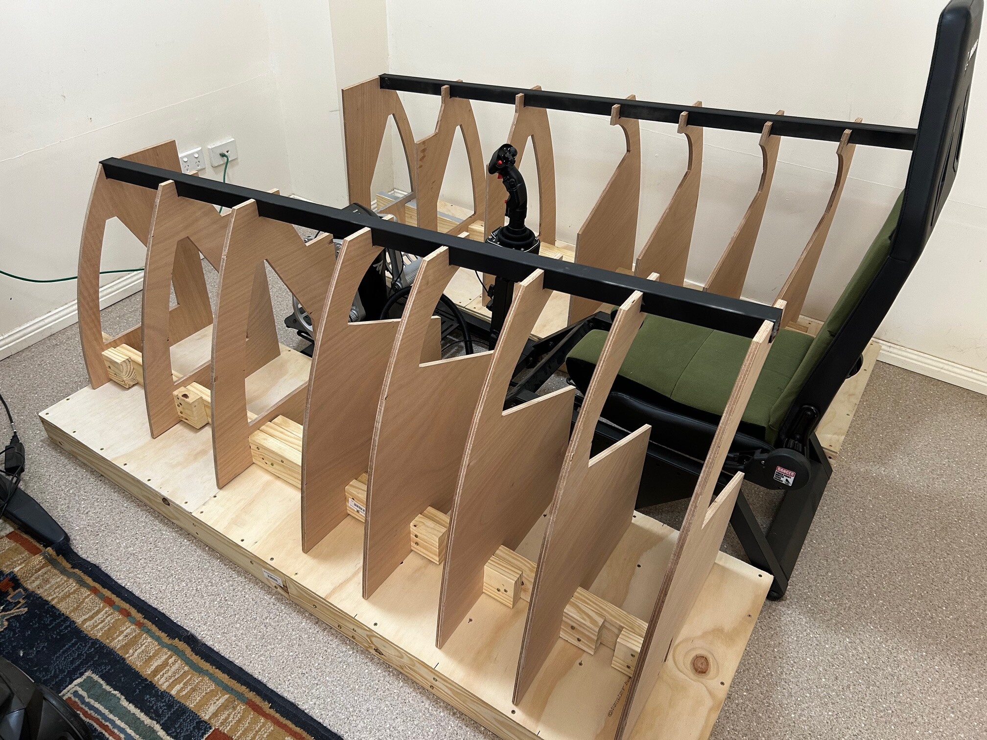 4. The pit is up at the right level now with the platforms both done. Support beams are in, and I have worked out the old man entry"" into the pit. On the 4 rib (from the rear) I will have a extended hinge so that the rear section open like a door for entry. Using an old tv wall mount as the hinge.. Tomorrow is measuring the sides into their correct spot and then fixing them to the bottom platforms.