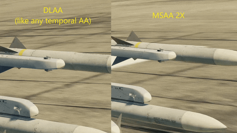 The Jittering appearance is the ghosting itself. The factor is the values (color) involved. It is a bit difficult to picture it with words, I understand. Tested with DLAA and MSAA 2X. The missile is properly attached to the wingtip rail. With temporal anti aliasing it looks detached because of some details of the rail remains with stationary appearance because of ghosting. Everything should wobble but together. (F-16s loaded wingtips are very wobbly) It is just the nature of the beast (temporal anti aliasing) as of today.