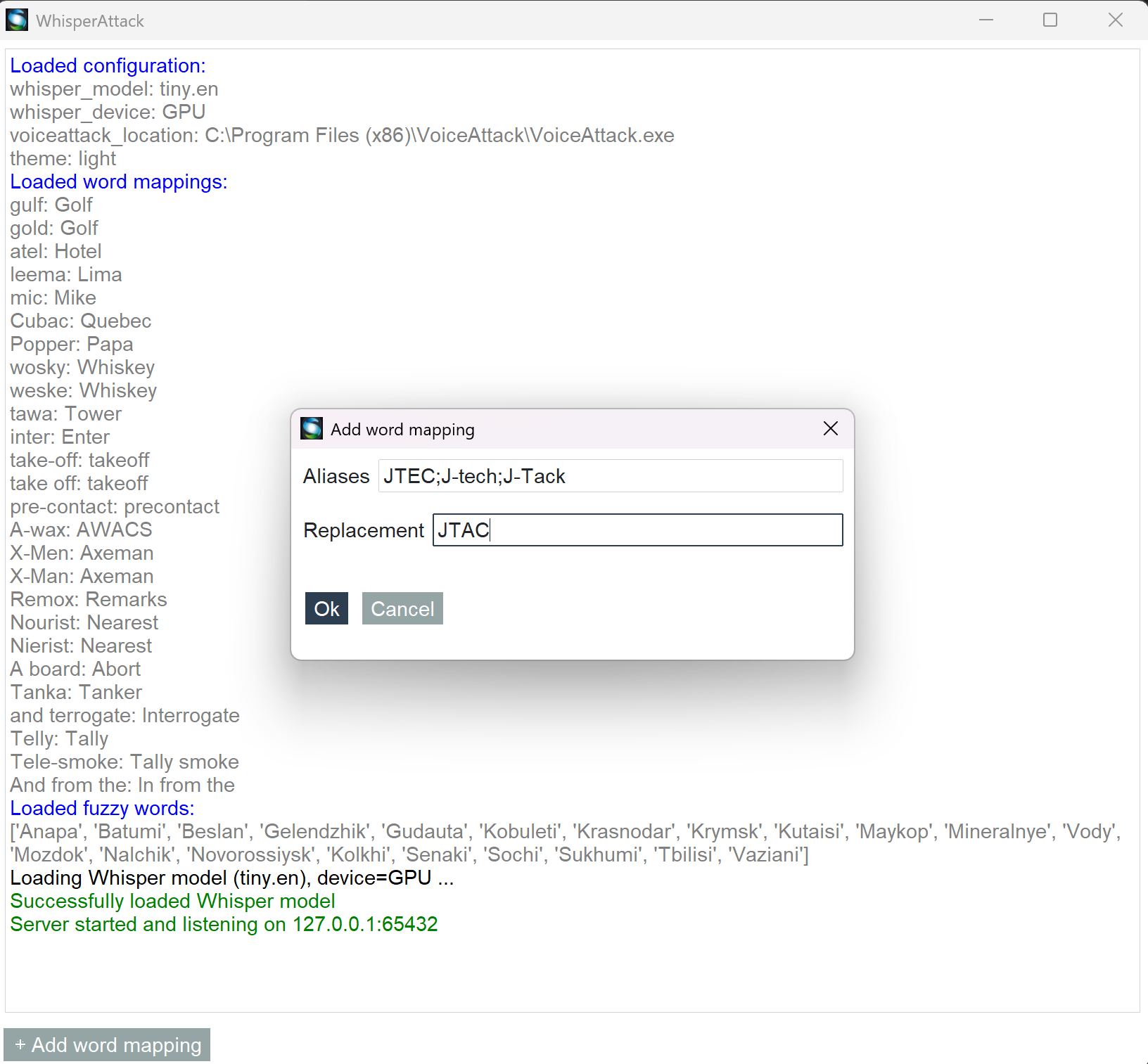WhisperAttack v1.2.1 is now available: What’s New? WhisperAttack now stores and reads custom configuration, e.g. settings and word mappings, from the %LOCALAPPDATA%\WhisperAttack folder. This means that upgrades will not overwrite your configuration. Fixes & Improvements Performance enhancement with transcribing speech to text. Fixed issue with text was not being wrapped when pasting into the DCS kneeboard. Fixed issue with base configuration files not being located in the same directory as the WhisperAttack application. https://github.com/nikoelt/WhisperAttack/releases