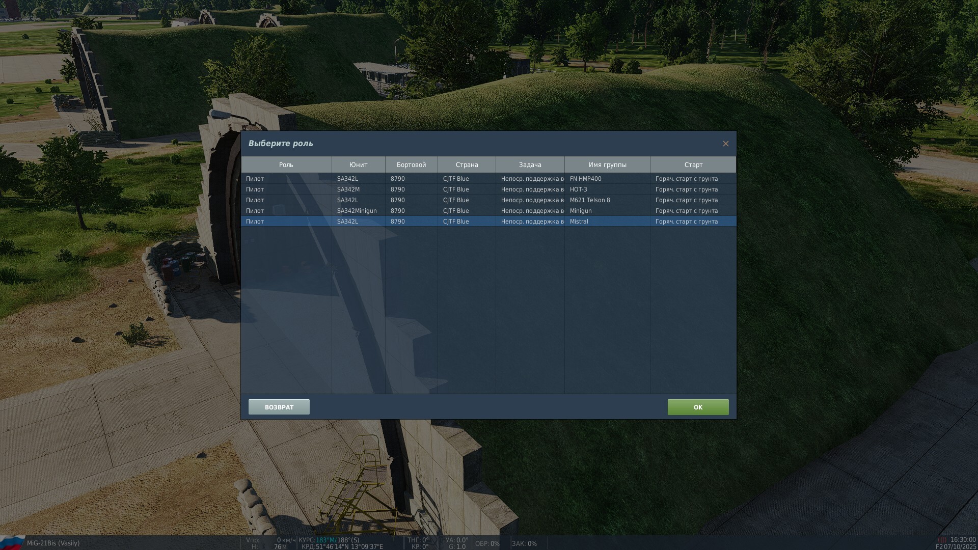 I created a mission at the Magdeburg training ground. You can try it. IInitially, there is no one at the training ground. You activate what you want via the F-10 radio menu. You can choose not to activate the radio menu and calmly destroy only the Roadblock. I recommend activating Blue Platoon, Red Platoon and waiting for the battle to develop. The enemies will be distracted and it will be easier to attack them. You will get a picture of the fight, just like in the movies. You can take a Mistral and launch four Mig-21s through the F-10. They can be activated via the radio menu at any time and they will fly to the training ground. Two JTACs, our own and the enemy's Mi-8, are working on the training ground. They will mark the targets with white smoke. Point 1 on NADIR is an enemy Roadblock, point 2 is your Base. You can listen to local FM radio on channel 31. null Magdeburg Training Ground SA342 REL .miz