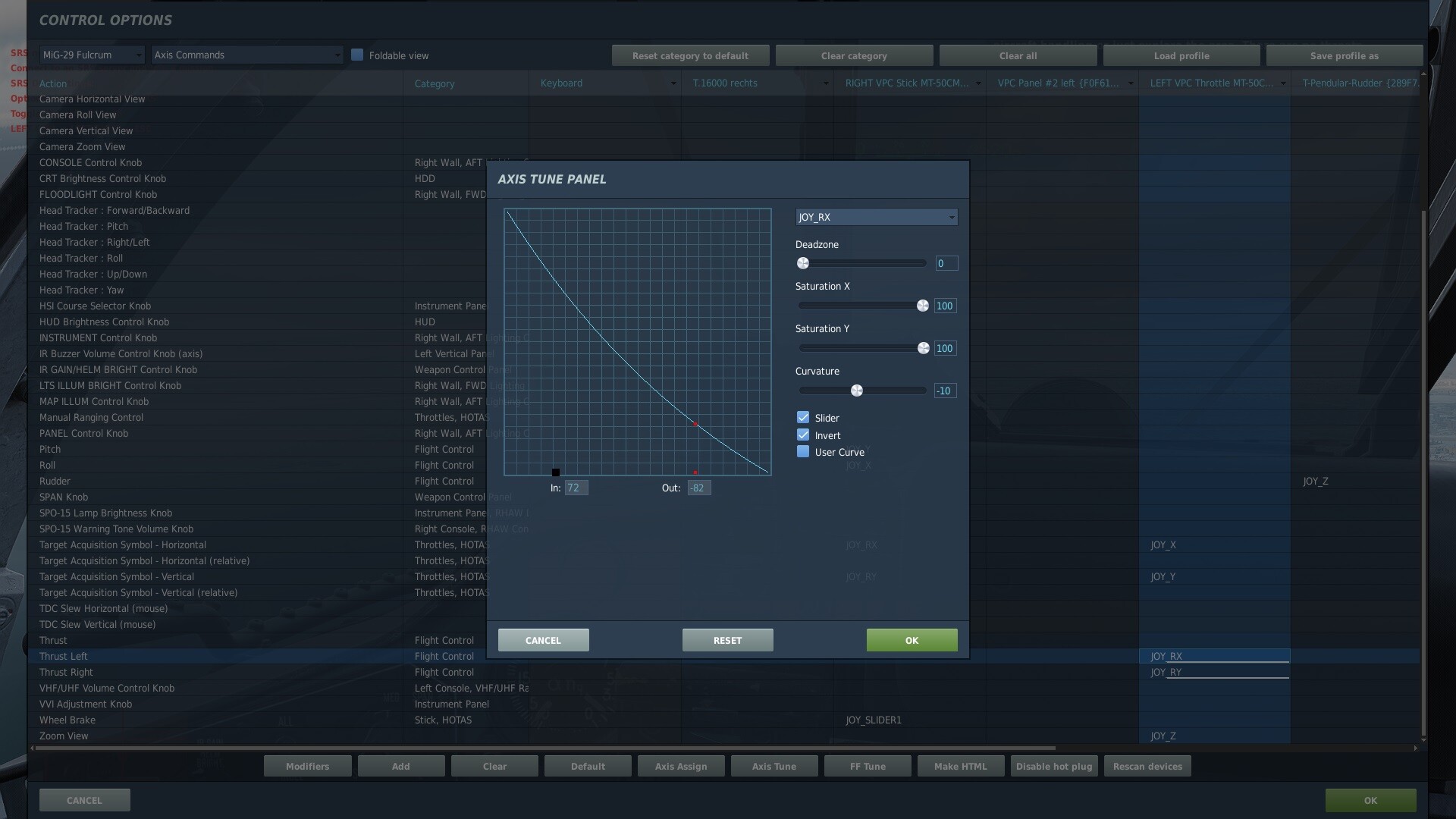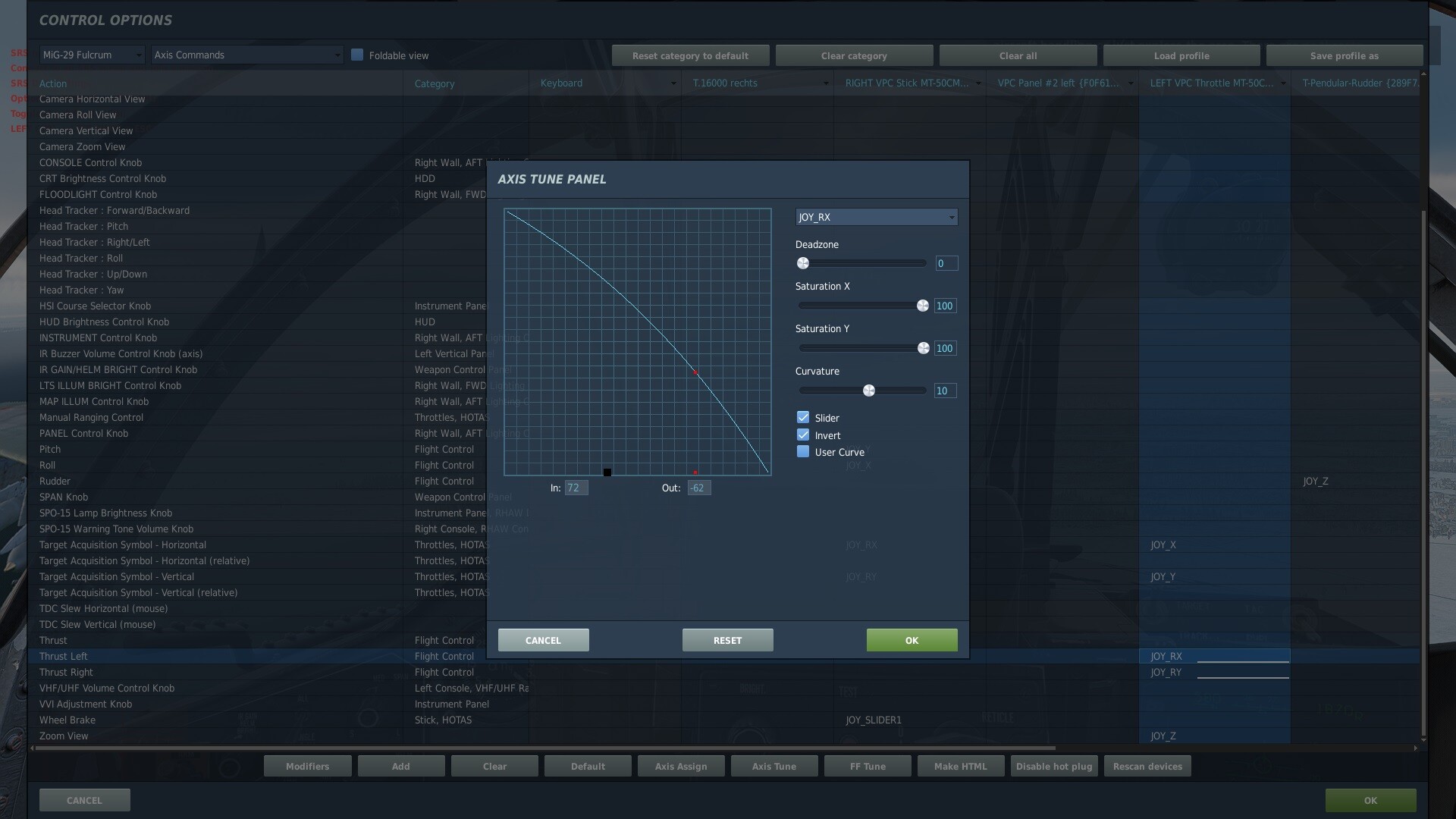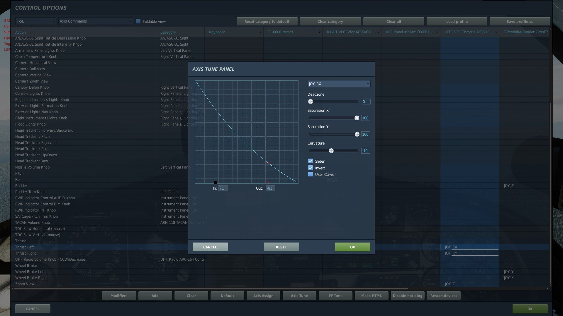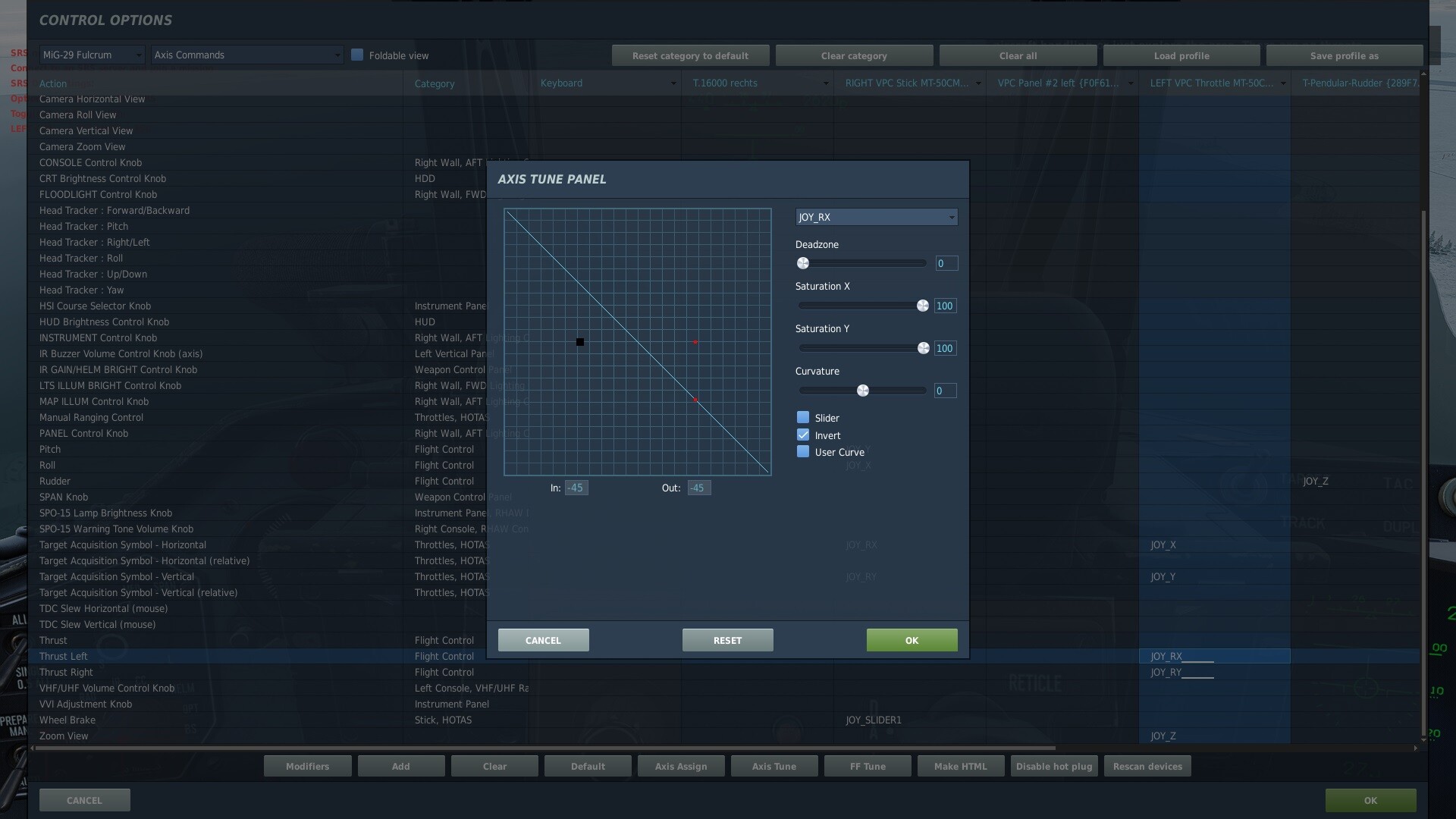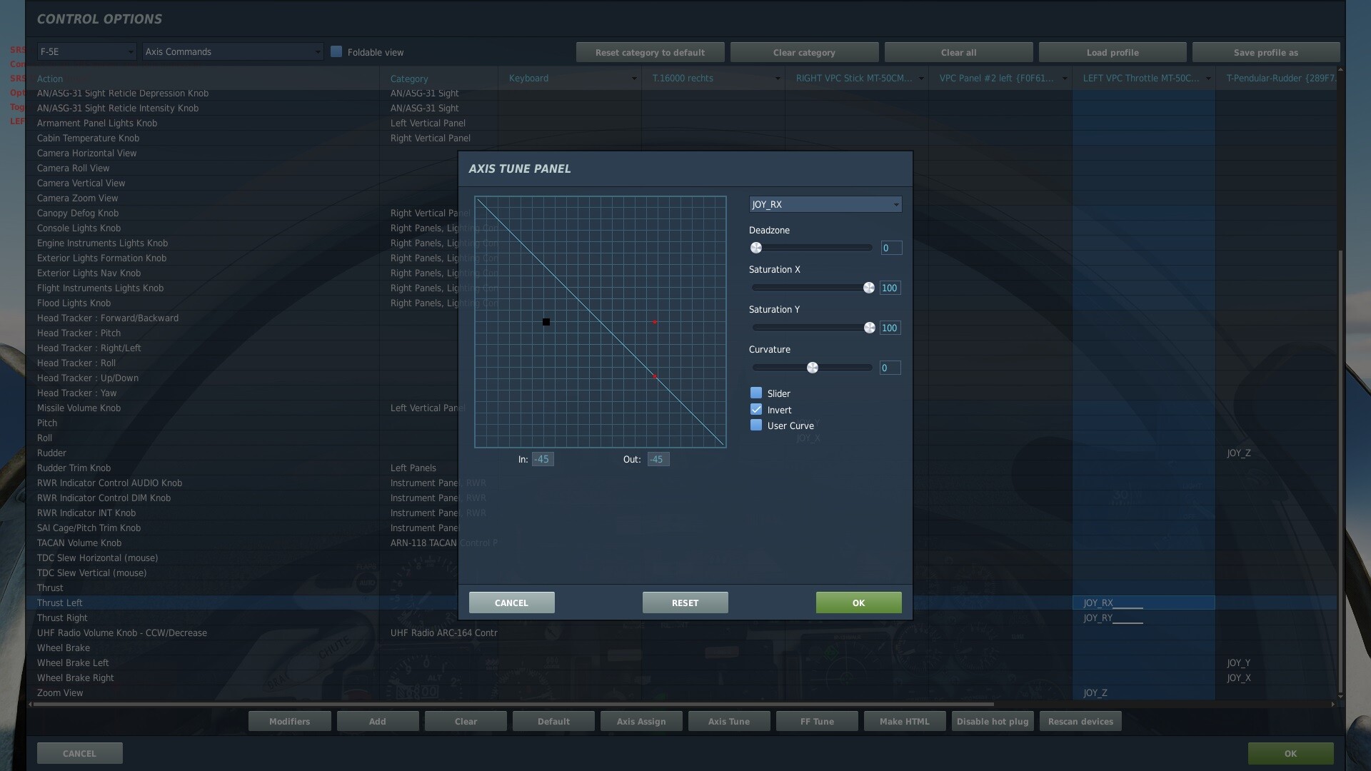 @BIGNEWY Here are some further test results: These are the settings that I set for my throttle axis for the Virpil CM3 throttle: After setting these values in an instant action mission, I did the same with the F-5E in an instant action and set these values to hit the physical AB detent. See how these values are basically inverted to those I set for the MiG-29: Next, I check the MiG-29 settings again in another instant action mission - and they have been overwritten to the values that I just had set for the F-5E?! Then, after restarting the game, I see these settings for the MiG-29... ... and for the F-5E - they are all gone again. Here's my log file as requested: I also see several .crash files in the logs folder, even though I quit DCS the correct way, there was no crash. Not sure if that means anything? dcs.log -