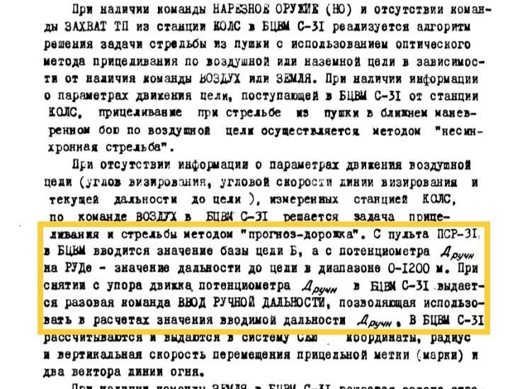 Translation atempt (AI: "...On the PSC-3I panel (and with data from COLS), the base value of the target B is entered. With the distance input (via a potentiometer), the range to the target is defined within a range up to about 1200 meters. If the system is moved from the stop of the potentiometer, a manual range input is produced, allowing the use of the input distance in the calculations of the range...."