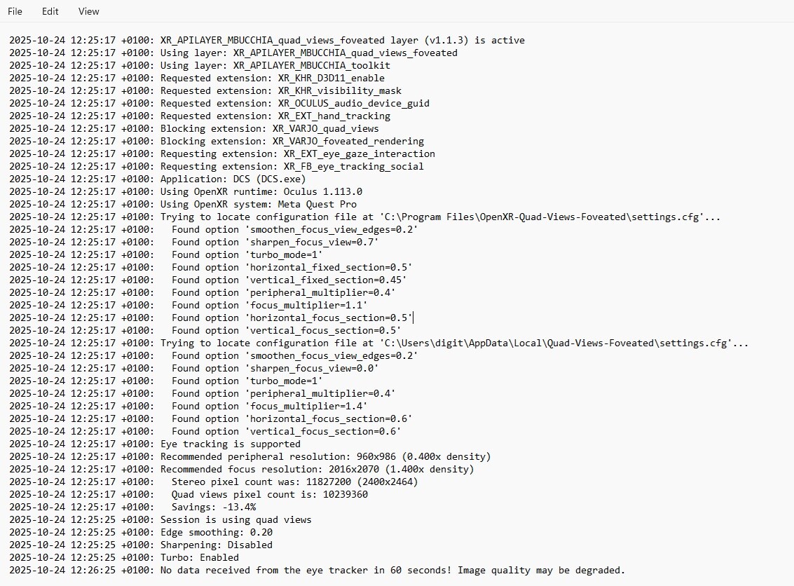 Feeling a bit stumped, I've tried the suggestions in this thread but to no avail. I also used the OpenXR layer manager but that seems pretty normal from what i can tell. The quad views log says "no data received from eye tracker" despite having eye tracking on in the oculus desktop app, phone app and the headset. I've re calibrated the eye tracking in the headset and that all works fine. Turbo mode seems to be ok now, its just the eye tracking that wont work. I've attached pics of the quad views log and OpenXR layer manager and what i think is my DCS log file. Its all very odd and I'm all out of ideas at this point, so any further help or suggestions would be very much appreciated. Edit: Just noticed my headset software needs updating, I'm still on v73 by the looks of it. Perhaps this is the problem.... dcs.log -