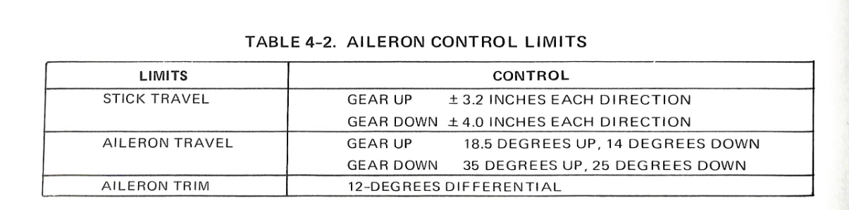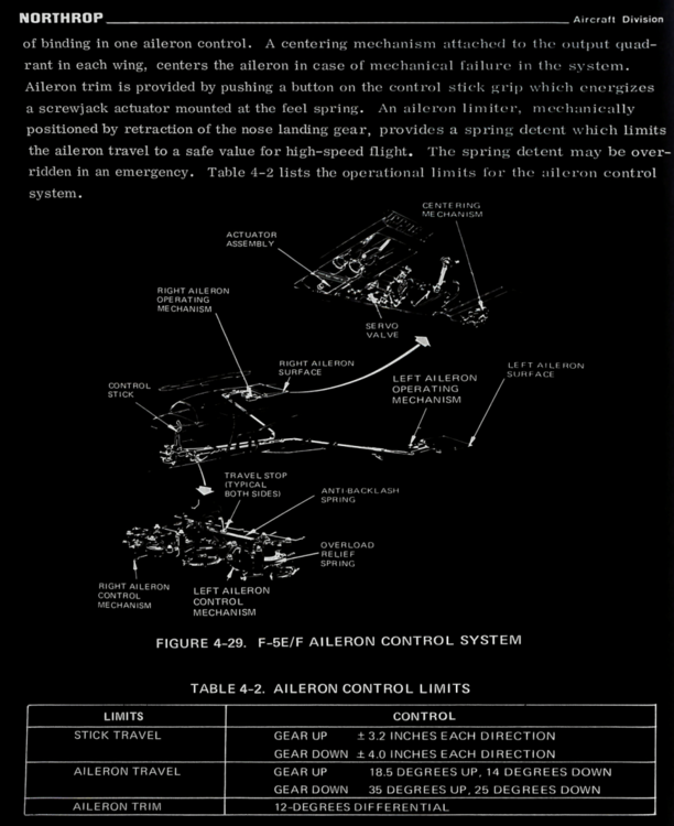 Sure, First lets clarify what is exactly stated in the flight manual about the aileron limiter. The flight manual states that full Aileron travel is 35 Degrees Up 25 Degrees Down. The manual also states that the spring stop limits AILERON TRAVEL to 1/2. The Flight manual does not state that the control stick is limited to half of its travel when the spring stop is engaged. The description of the aileron flight controls from the Northrop F-5/E Technical Description proves that the aileron limiter is physically located at 80% of the control sticks travel. This document contains the Stick Travel Limits, and the aileron travel limits. When the Landing Gear is down: The aileron limiter is turned off. And Full Aileron Travel is available, (35 up / 25 down), and Full Stick Travel to 4 inch is available. When The Landing Gear is UP, The aileron limiter is on. Aileron Travel is Limited to 18.5 Up / 14 Down, Stick Travel is Limited to 3.2 Inches. Thus when the Aileron limiter is active. The Stick travel is limited to 80% as (3.2 / 4) = 0.8 And Aileron travel is limited to 50 % as (18.5 / 35) = 0.52 Thus, the Aileron Limiter / Spring Stop is physically located at 80% of the sticks travel (3.2 inches) and limits aileron travel to 50%. As described in the pilots manual. If the stick is limited to 3.2 inches and the aileron 18.5 degrees, than limiter can only be located at 80% of the stick travel. - Today