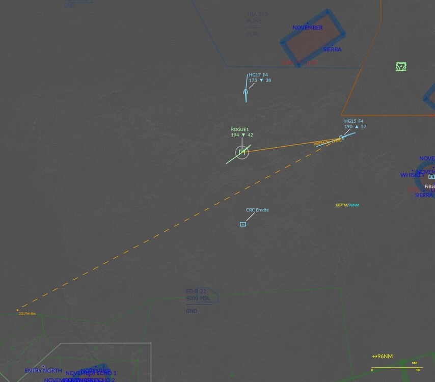 Im Rahmen der gerade stattfindenden Nachtflugperiode hat die 1./JG71 in Zusammenarbeit mit externem Piloten und Controllern kürzlich Night Intercepts geübt. Zwei F-4 wurden mehrmals vom CRC LONESHIP an eine in Ramstein gestartete F-5E (Callsign "ROGUE 1") herangeführt, die für uns Zieldarstellung zwischen Warburg und Cola TACAN flog. Alle Flights flogen IFR ab und kame später mit TACAN bzw. PAR approaches wieder zu den Heimathorsten zurück. ATC- und CRC-seitig wurden mehrere Stationen bedient, clearances, squawks und vectors vergeben und so den Piloten ein realistisches und immersives Flugerlebnis geboten. Fünf von sechs intercepts konnten erfolgreich durchgeführt werden. Wieder einmal ein toller Abend bei der 1./JG/1 und auf dem CWGNTS! Von Büchel Tower aus fotografiert: HG17 startet in die Nacht zur night intercept exercise. Radarbild von "Frankfurt Radar": HG15 wird von LONESHIP "nose cold" an den Bandit herangeführt, HG17 in Position für ein neues Setup gebracht. Die 1./JG71 "Richthofen" ist auch weiterhin offen für neue Piloten, die Interesse an möglichst realistischem Übungsflugbetrieb der Luftwaffe im Setting der 1980er Jahre haben und die "true grit" mitbringen. Schreib uns gerne eine PN hier im Forum, wenn Dein Interesse geweckt ist. Darüber hinaus suchen wir Kontakt zu "like-minded" virtuellen Staffeln und ATC+TAC/C2, um miteinander oder nebeneinander auf unserem "Cold War Germany NATO Training Server (CWGNTS)" zu fliegen, den virtuellen Himmel zu bevölkern und so gemeinsam eine realistische und immersive Flugverkehrssituation zu schaffen. Auch hier gerne Kontaktaufnahme via PN hier im Forum. -