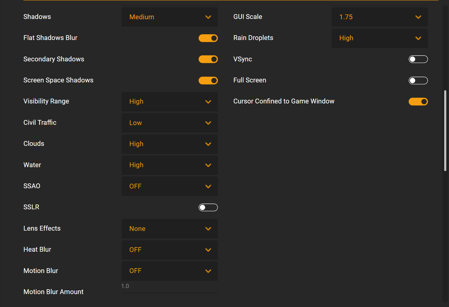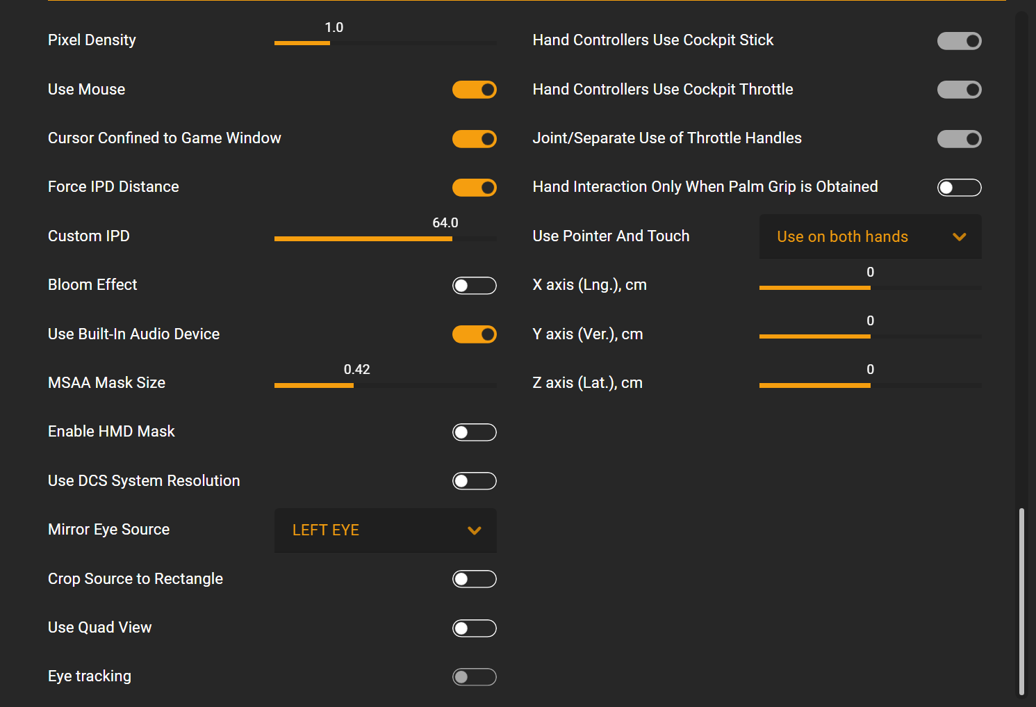 Thanks for the input. Hadn't scaled the F4U pilot yet. On that note: Moved the 'eyeball' forward, to the edge of the pilot exterior at 30° below Panel View, and down a bit, to improve direct shooting. SnapViews["F4U-1D"] = { [1] = {-- player slot 1 [1] = {--LWin + Num0 : Snap View 0 viewAngle = 54.750000,--FOV --FOV Cockpit Zoom 54.750000, 55.000000, 54.000000, OEM 85.000000 "F4U-1D" viewAngleVertical= 0.000000,--VFOV OEM 0.000000 hAngle = 0.000000,-- (Snap View)/(Cockpit panel view in)(-30°) vAngle = -30.000000,-- Cockpit View 0.000000, OEM 70.000000 x_trans = 0.054000,-- Cockpit View In_Trans 0.054000, OEM 0.150000 y_trans = 0.040000,-- Cockpit View Up_Trans 0.040000, OEM 0.030000 z_trans = 0.000000,-- Cockpit View Rt_Trans 0.000000, OEM 0.000000 rollAngle = 0.000000, cockpit_version = 0, }, [13] = {--default view viewAngle = 40.000000,--FOV Cockpit Zoom 40.000000, 40.200000, 39.420000, 37.500000, OEM 85.000000 "F4U-1D" viewAngleVertical= 0.000000,--VFOV OEM 0.000000 hAngle = 0.000000,-- (View Center)/(Camera Snap View Down)(-30°) vAngle = 0.000000,-- Cockpit View Angle 0.000000, OEM -11.500000 x_trans = 0.054000,-- Cockpit View In_Trans 0.054000, OEM 0.150000 y_trans = 0.040000,-- Cockpit View Up_Trans 0.040000, OEM 0.030000 z_trans = 0.000000,-- Cockpit View Rt_Trans 0.000000, OEM 0.000000 rollAngle = 0.000000, cockpit_version = 0, }, Also set the stick curves to "11" in roll, and "22" in pitch, which resulted in a balanced and less twitchy airplane. Bowie