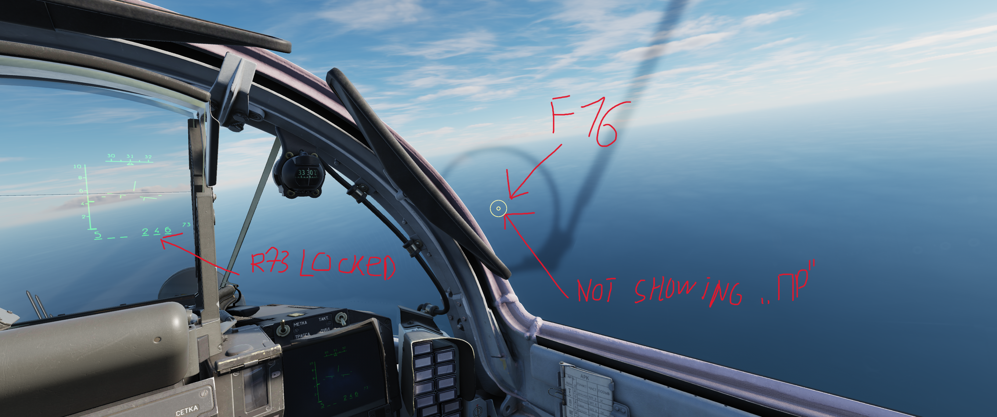 2. When starting mission in air, I try to lock target with helmet mode without IRST and here no sound and proper indication on monocle, but on HUD I see what R73 is locked on and I can fire. I guess this is a bug, because before update indication was fine.