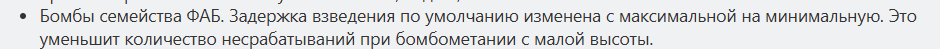 Максим, возможно дело в недавнем обновлении от 24.09, где было сделано: Настроить же задержки можно в редакторе миссии или вызвав меню перевооружения в игре, далее выбрать нужную бомбу и кликнуть по оранжевому треуголнику: Но не факт
