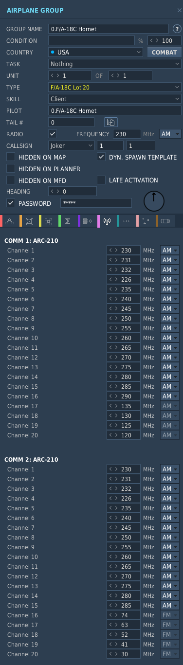 These edited screenshots show the radio frequencies of my template aircraft depicted in the track file.