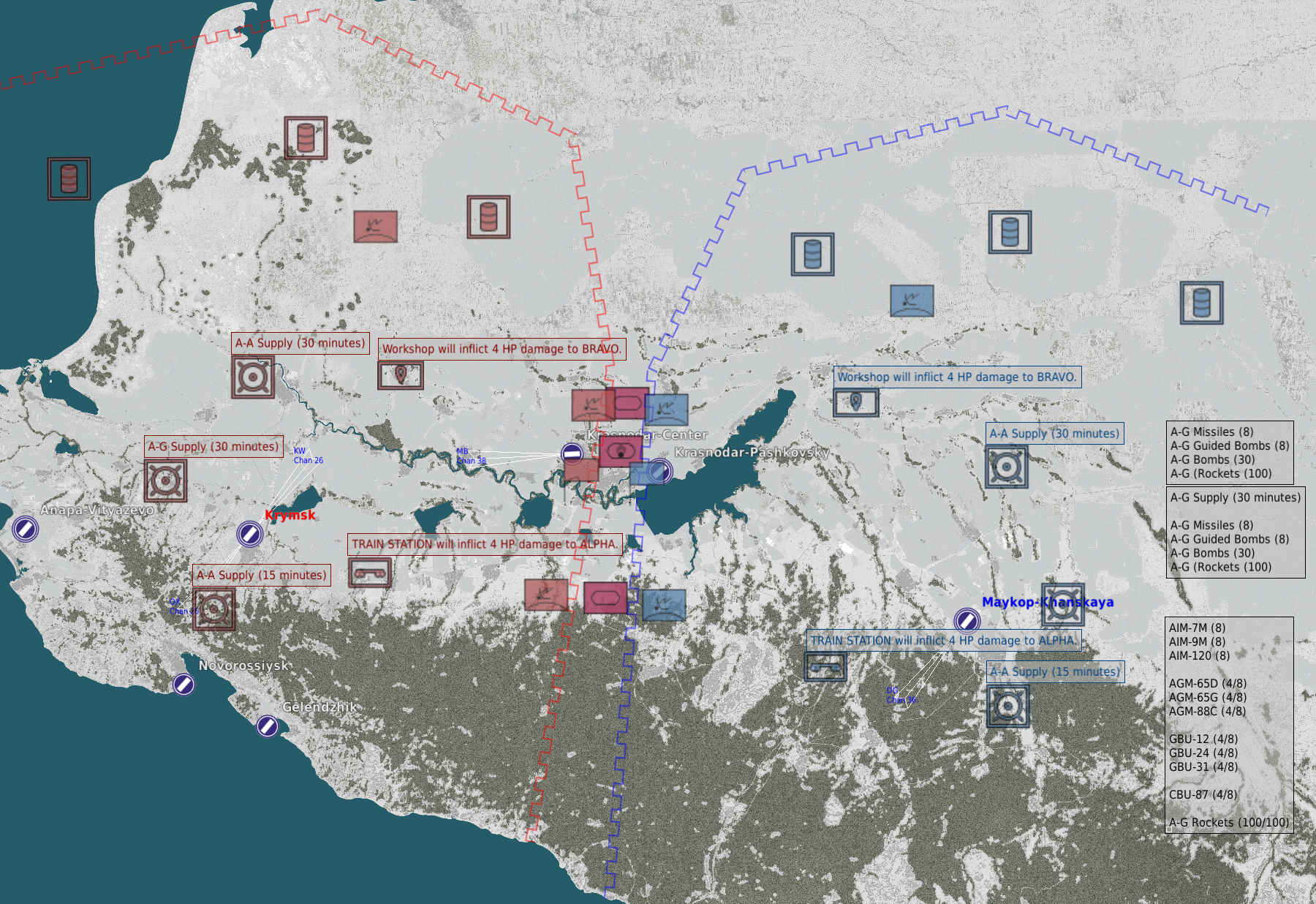 Θέατρο: Καύκασος — Maykop (Bluefor) vs Krymsk (Redfor) Διάρκεια: 90' Πόροι: 12 αεροπλάνα / τύπο. Εκρηκτικά: A-A (8/τύπο), A-G (4/τύπο), GBU-12/24/31 (4 κάθε). Ανατροφοδοτήσεις: Depot A (A-A) ανά 15 λεπτά, Depot B (A-G) ανά 30 λεπτά Depot C (A-A) ανά 30 λεπτά π.χ. Υπάρχουν 8 ΑΙΜ-120Β διαθέσιμοι στην αρχή της αποστολής σε κάθε αεροδρόμιο. Όταν κάποιος φορτώσει βλήμα τότε αυτό θα αναπληρωθεί σε 15 ή 30 λεπτά. Ο μέγιστος διαθέσιμος αριθμός ανά πάσα στιγμή είναι 8. Για τους HARM (AGM-88C) ο μέγιστος αριθμός είναι 4 και αναπληρώνονται σε 30 λεπτά. Καταστροφή ενός depot ακυρώνει την ανατροφοδότηση. FOX-2 και Βόμβες γενικής χρήσεως δεν εξαρτώνται από depots και αναπληρώνονται ανά 15 λεπτά.