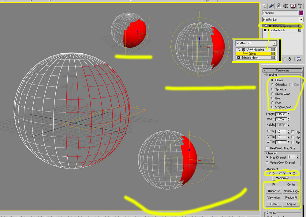 Есть разные способы. С помощью плагинов например. Вот простой способ, применимый во многих случаях: 1. Работаем с сеткой Edit Mesh. Выделяем треугольник, полигон, или область полигонов, на которые должен лечь кусок листа текстуры, или весь лист целиком. Применяем к нему материал с текстурой. 2. В списке модификаторов справа выбираем UVW MAp. С помощью панелей управления выбираем способ проецирования текстуры на область полинов. В зависимости от формы области или отдельного полигона это может быть разный способ. плоскость, сфера, целиндр.. 3. Кликнув на + возле наименования модификатора выделяем габаритный контейнер (Gizmo), и манипулируем им, перемещая проецирумую область туда, куда нам надо. Короче подгоняем проекцию текстуры под выделенную область. Это не всегда требуется. Но иногда без этой манипуляции не обойтись. На скрине разные варианты проекций текстуры на выделенную область сферы.1 point