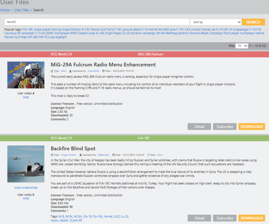 Dear ED, I'm an avid fan of DCS, having purchased all modules, tech and maps that you offer, and I have contributed the odd mission and other titbit to the DCS community. I want DCS to thrive, and that is why I am taking time and effort to try and improve the "DCS experience". I believe that good content is what will make or break DCS in the future, especially good user-created content. In the past months I've been troubled by - what I think - ED's failure to put their best foot forward when it comes to presenting (or accessibility) of user-created content on their "User Files" repository. I like that ED provide a repository for users to share their work - that is excellent! While I believe that the process for users to share their work can benefit from your immediate attention (I recommend that ED build sharing, and updating, missions into Mission Editor), I believe that discovering content may be in even more urgent need of improvement. I believe that integrating mission discovery into DCS's main could also be a significant step into the right direction, yet that is not my focus here. Let's assume that a user has found their way to ED's User files (I maintain that today this is a hurdle far too few people are willing to overcome and should be addressed). From my experience, finding content, even for people who know where to look, is disquietingly unintuitive. Please allow me to give an example: In the past I created two "Tourist Map" missions and shared them at user files (here and here). The goal of these maps is for players to explore points of interest on their map. For "Sinai Tourist", the kind folk at OnReTech provided me with location info for those POI, for "Hamburg Tourist" I knew them from when I grew up there. Now, for both I created an easily re-usable script so people can re-create similar tourist maps for "their" cities, and people have asked me if they can use these scripts. Of course they can -- I want more great tourist missions, I'm looking forward to seeing these contributions. So, occasionally, I search ED user files for new "Tourist" maps, and I find that ED user file's search function to be less than intuitive to use. For example: I enter 'tourist' into the search box, and press return. I get the following: Please note the distinct absence of any relevant "tourist" missions, it seems the search term isn't applied at all. "Very well", I thought, so maybe I'm not sorting by the correct term. I open up the "sort by" dop-down - which posts more questions that it answers. "Relevance" didn't do anything - what does it mean? And "Ratings"? I believe is has been a couple of years since you (thankfully) removed that troll-attracting attribute. Are there still ratings being kept, and if so, how are they managed? If not, I recommend that this is removed from the 'sort by' drop-down. So, it seems, today I am too stupid to figure out how to get a list of all missions that contain the word "tourist". What am I doing wrong? How can I get a list of missions that contain a keyword in their title? And while I'm at it - there now seems to be a mysterious "vote" link at a mission. Whatever is this for? What am I voting for if I click on it? What are the consequences? Will this perhaps provide some algorithm with data so I am served similar missions in the future (that's what I'm hoping). Put differently: Why is there a vote link? What does it do? Why would I want to click it? I strongly recommend that ED improve the User Files interface to be more user-friendly, obvious, and self-explanatory so stupid people like I can better navigate its content. I believe User Content can drive DCS's popularity, and I believe ED's User Files can contribute more if the interface improves.14 points