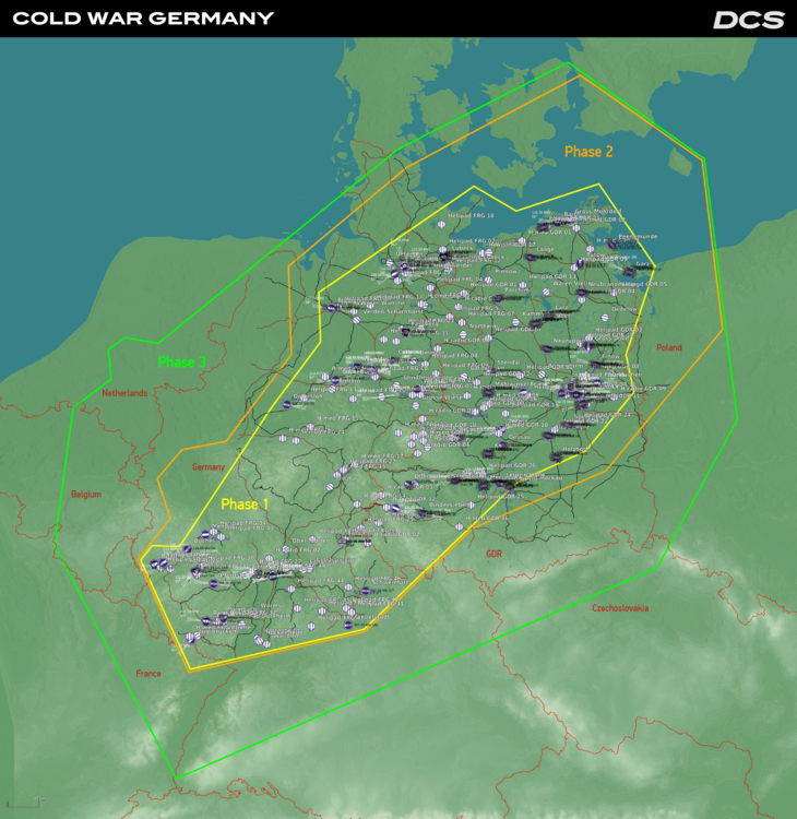 1. What are the system requirements - We recommend 32 GB of system RAM and 8 GB of VRAM 2. How much disk space is required? - 205Gb (Phase 1 - 110 Gb) 3. How much does DCS: Cold War Germany cost? - $55.99 USD at early access release and then later $69.99 USD at final release with all three phases. 4. How will the map be sold, as a whole or in parts? - The Cold War map will be released in phases, with each phase adding more terrain, airfields, cities and other features. Three phases in total are planned. The map will only be sold as the entire map. 5. What are the dimensions of the map? - 980 x 800 km 6. Will assets be released and when? - We have received many such requests. Ugra-Media will do everything possible to release a Cold War Germany assets pack with objects and equipment following the release of Phase 3. 7. Why are there static objects on the map if I can place them myself? - We were guided by the interests of the users. First, we did it for the sake of performance and FPS, and this is the best solution. You immediately get a polished product that allows you to fly without additional work in the Mission Editor. The world is already filled with life and details, but at the same time, free spaces are left open for your creativity; you can add your own objects without interfering with the rest of the map. 8. When will the seasons be released? - Autumn and Spring will be released with Phase 2. and Winter will come with Phase 3 9. Will there be destructible buildings? - Yes, most buildings have destruction models. Traditionally, this does not apply to original objects. 10. Will there be RSBN beacons on the maps? - Yes, East German airbases are already equipped with RSBN beacons. 11. Will you make SAM sites? - 40 SAM sites have been placed on the map, and some air bases include prepared SAM sites. 12. What airfields will be on the map? Full details on Phase 1 here (Cold War Germany Phase 1 Airfields and Bases) Phase 1 (59 airfields) @Hidden list@ Helicopter bases 4 and a lot of helipads: Airfields for small aircraft (27) : Phase 2 (10 airfields): Phase 3 (51 airfields): 13. Where can I see the progress of development? Here is our topic where we post information about the map, screenshots and videos:51 points