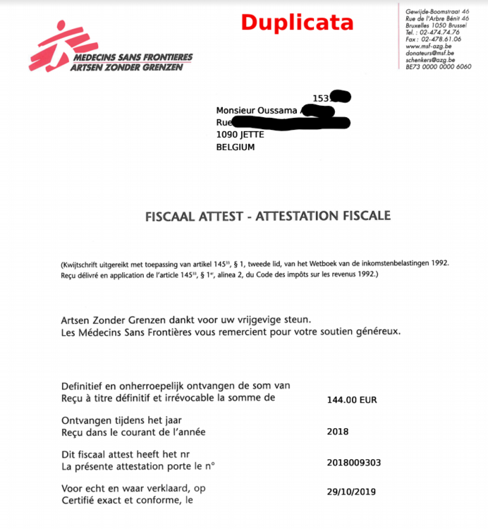 I am a regular donator (12eur / month since 2017) to MSF Belgium. I would be glad to participate if elligible :) Please find attached my latest attestation from MSF.