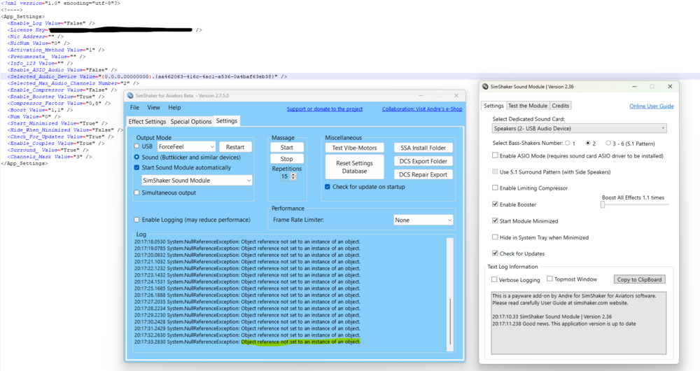 Additionally the log in C:\Users\<user>\AppData\Local\SimShaker for Aviators\log.log contains the errors: |ERROR|SimShaker.UI.ProcessManager|System.InvalidOperationException: No process is associated with this object. at System.Diagnostics.Process.EnsureState(State state) |ERROR|SimShaker.Core.DataProvider.DCSDataProvider|System.NullReferenceException: Object reference not set to an instance of an object. at SimShaker.Core.DataProvider.DCSDataProvider.disconnect() I cleared all settings for both apps and now sound module (latest beta) starts with ssa (latest beta). I only get the error displayed. I can test with previous version of SSA in case something changed with latest update. -