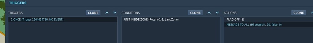Hello everybody, I'm back here with another question. On this topic I have done a lot of research and, if I understand correctly, it seems that it cannot be done except by resorting to MIST. So in the hope that something has changed I propose the question again. I have a landing event for a helicopter, and I need, that within the script of the aforementioned event there is a check if it is inside a trigger. Basically, if the helicopter landed inside the trigger, then take action, otherwise do nothing. By simply using the event script and using the simple editor functions, it apparently works, but it's just an illusion. Any suggestion is welcome !!