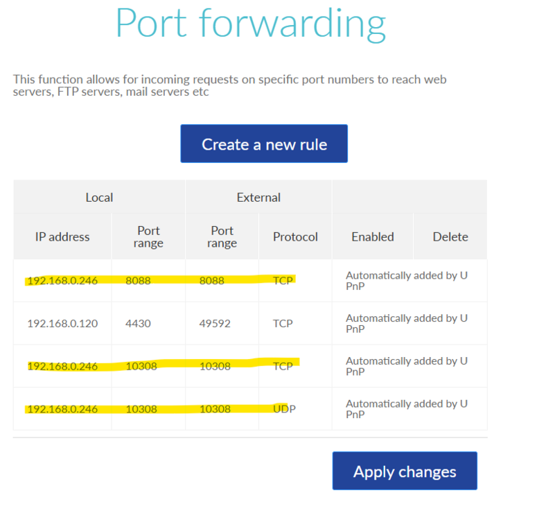 I'm getting a little closer. I have attached a wireless router to the Internet router, as I connect to the PC with a Quest 3 via Virtual Desktop. So the PC is connected to the wireless router via LAN cable and the wireless router is connected to the Internet router via LAN. I have tried to open port 10308 of the DCS server on the wireless router, as I did with the Internet router. However, the wireless router does not allow this. The wireless router only “sees” my PC and not the DCS server. Although I can ping the DCS server from the PC. From the PC, I am able to ping the DCS-Server Any advice?