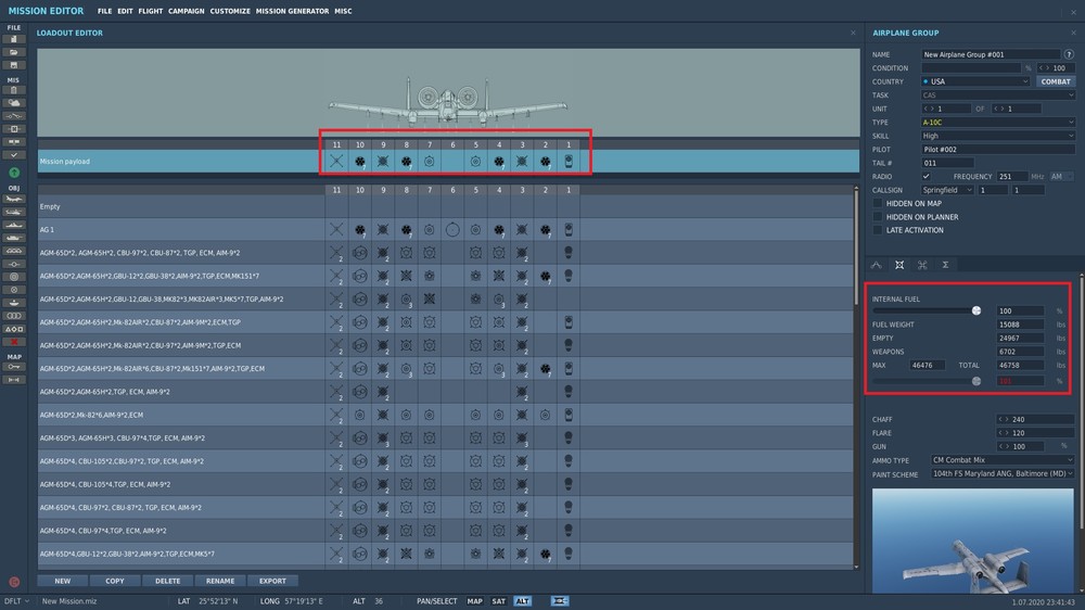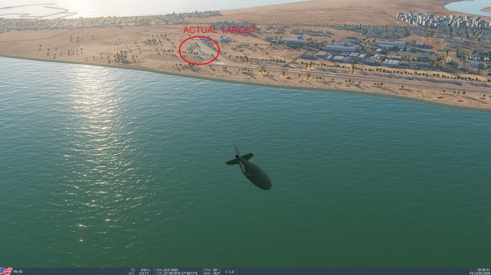 Then, with a target selected on Bandar-e-Jask airfield, the auto-release cue for dropping a MK83 bomb of it is misaligned, see MK83Auto_1.jpg. I understand that there is wind but that is way too weak to have such influence. Releasing at the point calculated in auto-release mode results in a miss by more than a mile, see MK83Release_1.jpg.