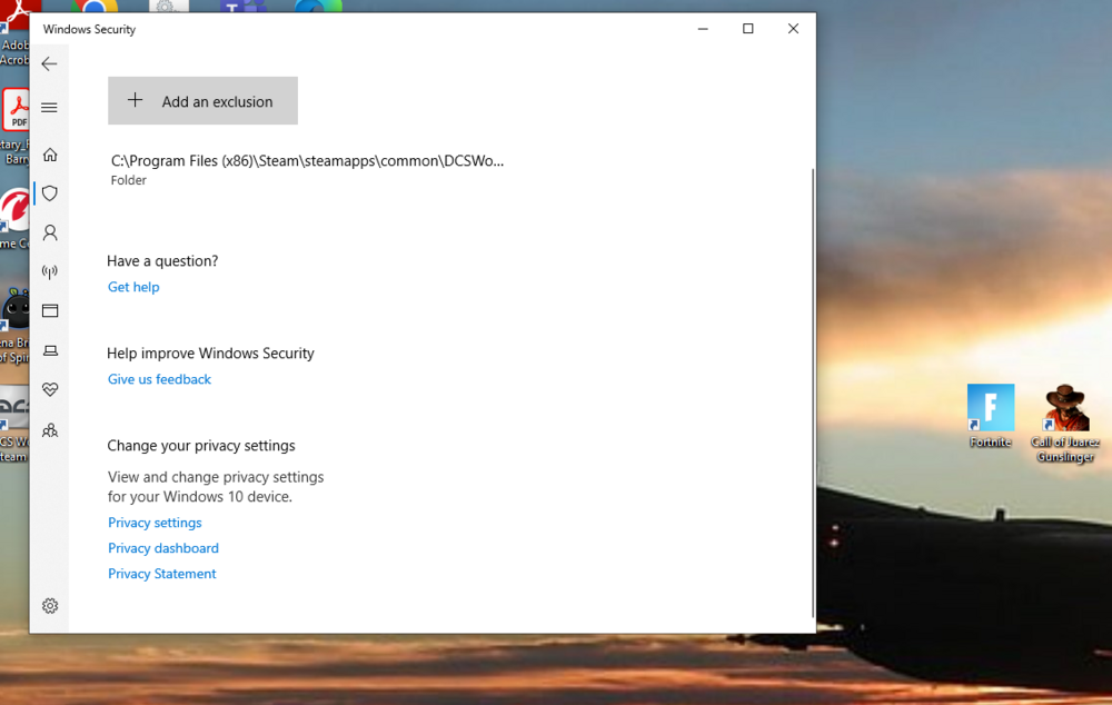 Thanks for the help MAXsenna - please excuse my frustration that may come across as venting - it's just that I started getting rather frustrated with DCS a which is what lead to me uninstalling it in the first place, and this certainly doesnt help when coming back to it. Anyways, I have just uninstalled and am reinstalling DCS via Steam. Here is a screenshot of my exclusion; null -