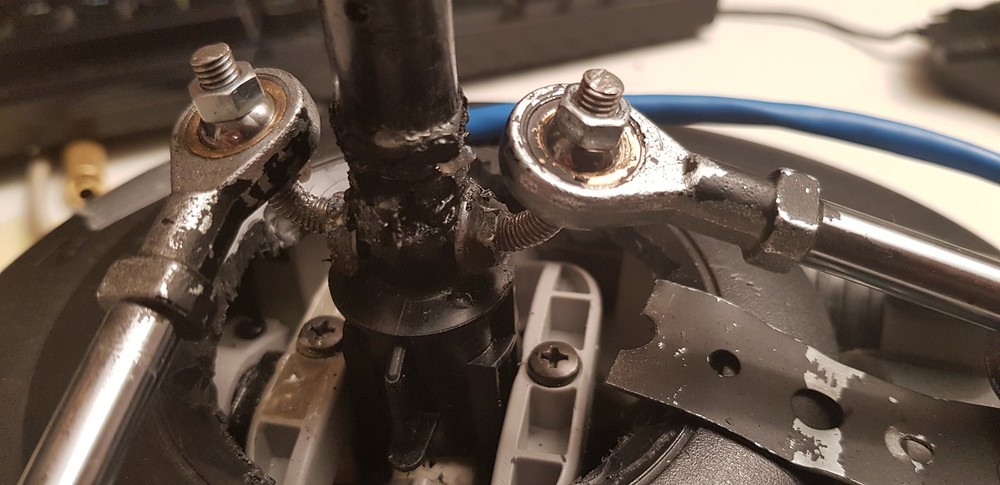MS FFB2 hall sensor mod, which sensors and setup?trigen replied to trigen's topic in PC Hardware and Related Software For the dampers i am using pocket bikes steering dampers. While great for my Anti torque pedals with 1 i find them much to strong for the stick setup. I drilled a lot of rubber seals out and replaced the oil to get them right. Had to fill in with electric tape inside instead of the rubber there too. Its also very hard to get them equal this way so i would not use them for the Cyclic unless its a heavy one. https://www.ebay.co.uk/itm/Mini-Midi-Moto-Minimoto-Pocketbike-Steering-Damper-Kit-Blue-Midibike-Racing-Bike/192374434974?hash=item2cca68ec9e:g:-csAAOSwY~1Z6g66:rk:1:pf:0 I am have some 65mm 1/10 scale on the way myself but im also interested in these as they look like the oil goes out into these containers trough a tube. https://www.ebay.co.uk/itm/RC-Piggyback-Hydraulic-Shock-Absorber-Springs-Shocks-for-1-10-Rock-Crawlers-Car/223034560752?var=521843722047 I got some plans today of attaching bot dampers to the Gimbal . the X i can do fairly easy but the Y needs to get a bracket so both will be completely independent. You can get the general idea here. I want to get the damper throw as small as possible which in turn gives more leverage and perhaps some less stickiness from the dampers. If they do at all. For this stick currently like mentioned it feels great. Dont really notice the slight movement of the other dampers when moving in just one axis but ill sort it with the bracket etc nonetheless. I initially thought the damper was a bit weak but turned out not to be the case. Dampers only, the stick feels great! It also feels great with FFB (not much difference in feel but you got forces) but the springback and forces are a little reduced so it wont go back to perfect center all the time but almost. I would not have used this stick without the dampers. It makes a big difference in the stick feel. I can fly with just finger pressure with either or both on.