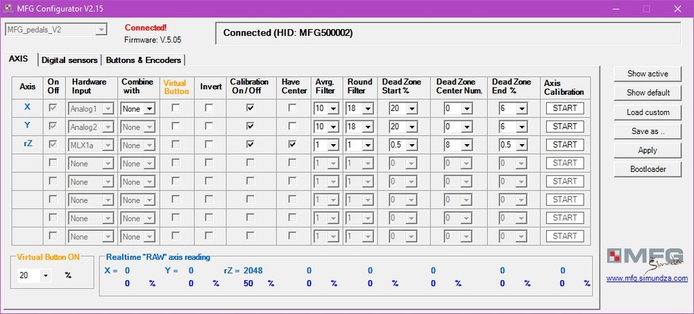 It should look like this. Make sure each pedal is at zero - 4096 when depressed. If not, use the START calibration buttons - DON@T FORGET TO HIT "APPLY". when you're done -