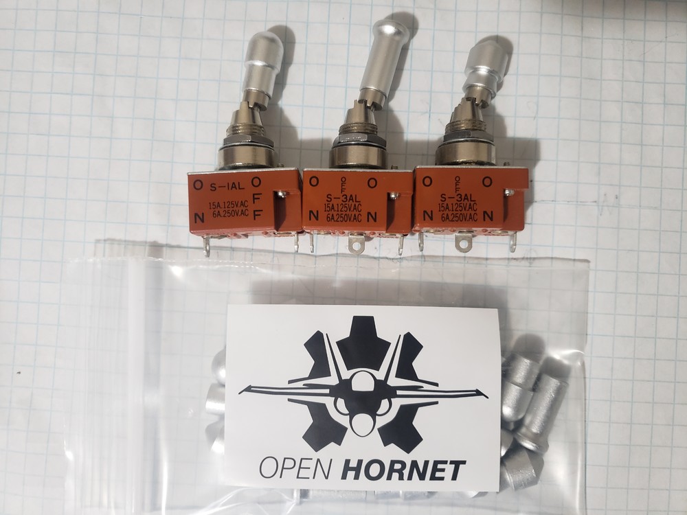 Hey all. I recently did a run of Switch Bats for the F/A-18C for OpenHornet. I have 5 sets left. They are made from 6061-T6 with a natural anodize finish. They were designed to be installed on the NKK S1AL, S2AL, and S3AL locking toggles and the bat profiles were measured from the mil switch equivalents (though slightly adapted to be compatible with the NKK switch). I am selling them for $207.74 USD plus shipping. Please PM me if you are interested in a set! Each set consists of 9 rounded bats, 12 conical bats, and 5 tall "hat" bats. If there was enough interest, I could do a run for F-16 and A-10 pit sets as well. (Just need a decent number of bats overall to make it economical to have a run done.)