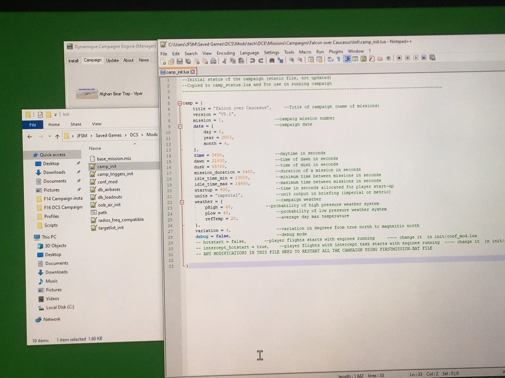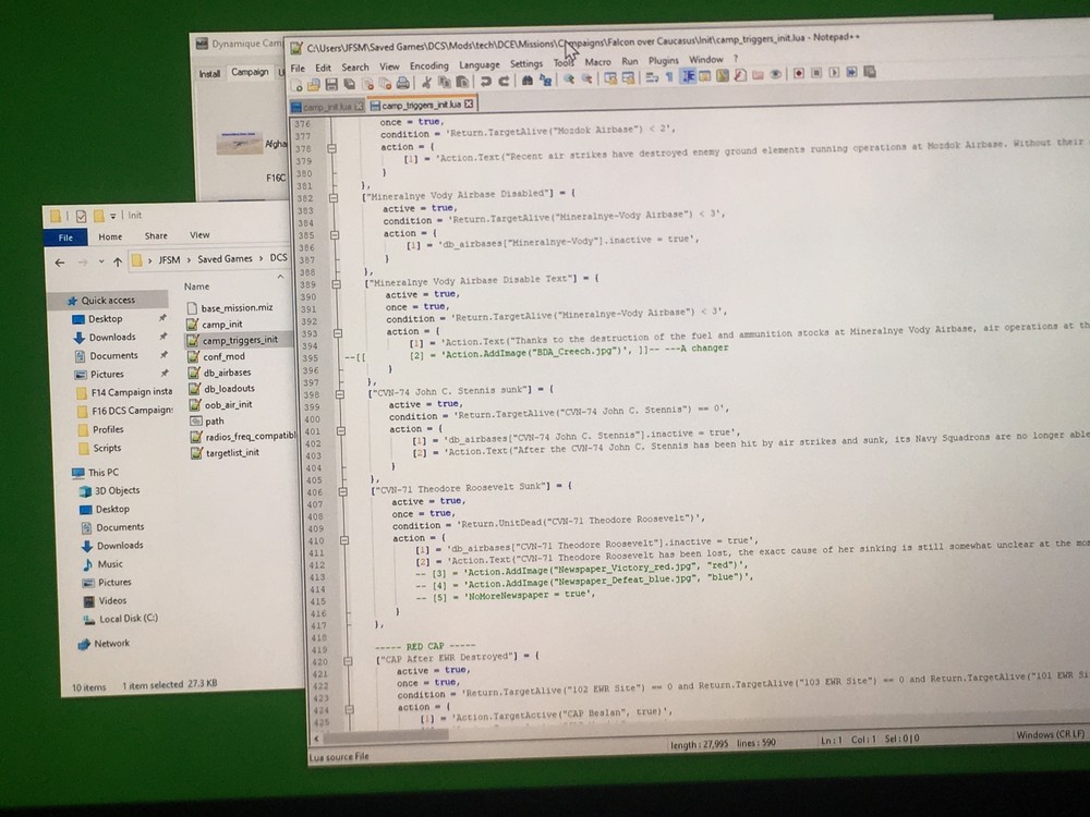 Hi Miguel. Attached are is my complete init folder for Falcon Over Caucasus. Hopefully it is obvious to you why I am unable to start. Thanks base_mission.miz camp_init.lua camp_triggers_init.lua conf_mod.lua db_airbases.lua db_loadouts.lua oob_air_init.lua path.bat radios_freq_compatible.lua targetlist_init.lua