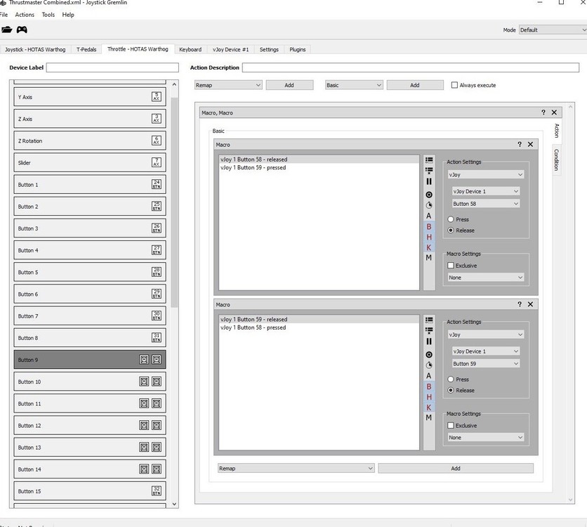No, both actions need to be an action condition. Joystick Gremlin just always defaults to Keyboard condition, so it looks in the screenshot like it were not an action condition. Glad it works now! A last thing: If you want to try long and short button presses: these work with „Tempo“ instead of Macro. Then you can simply assign two virtual buttons to a single physical button and define a time delay before a long press is activated. I live this for switching FCR range in the F16.