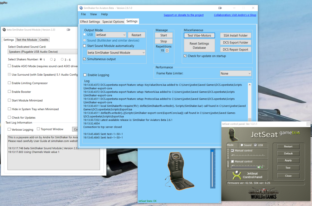 [Official] SimShaker for Aviatorsjoebelter replied to f4l0's topic in PC Hardware and Related Software I'm having a problem with my Simshaker sounds not vibrating when I do a test in the Avaitors app. My jet seat tests fine, but when I either choose testing them together or Simshaker itself, I get nothing. When I use the Simshaker main app and test it there it does put out vibration/sounds with the various choices. Using the latest betas for both apps. Any ideas of what I could look for? Tried the troubleshooting from Andre's page first. Appreciate any help, it's been BULLETPROOF for over a year! Joe