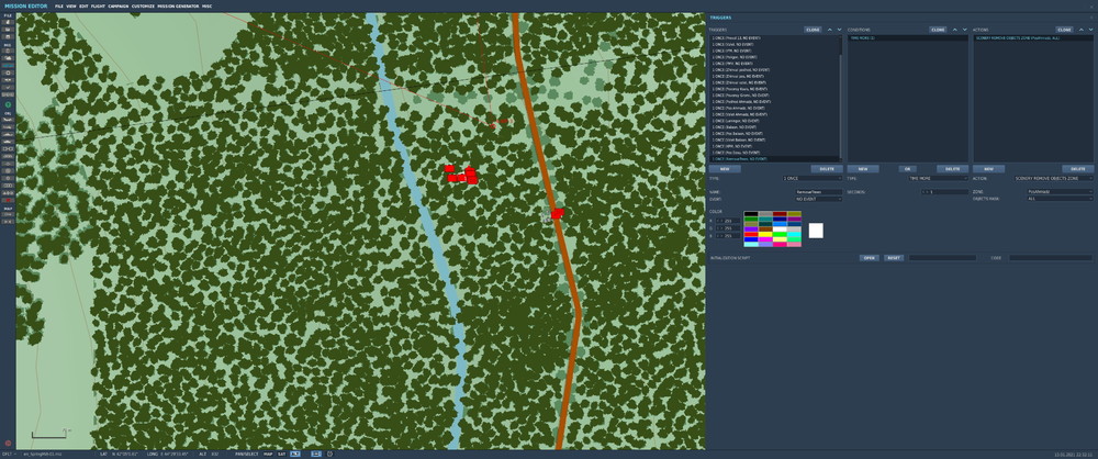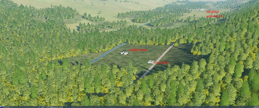 Looks like the trigger to remove the trees is not working reliable. After looking into the mission in the ME and start it out of there again i also saw only trees at that outpost, very strange. EDIT: Started DCS again and started the mission on 2 different ways 6 times again and everything was working correct again, very strange! -