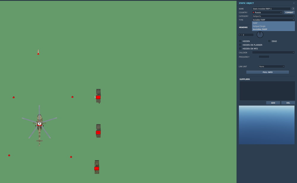 There is no need for mods, DCS comes with an invisible FARP. Just put it down where you want, put some markings around it so you know where to land and some ground support units to refuel/rearm. MI-8_inv_FARP.miz
