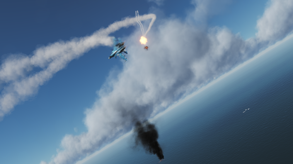 Не эксперт, но откуда дымный след при попадании в маневрирующую цель, ведь двигатель работает ~37с? Каковы условия пуска тогда... При попадании в неманеврирующего дрона похоже двигатель того, что поражает цель (большая ракета визуально) работает. Вероятно кадры для иллюстрации, как и многие другие в фильме. Мурзилки похлеще «угарной силы». А вот то что гидравлика сломалась и самолёт упал, это ценные кадры. Надеюсь смоделируют.
