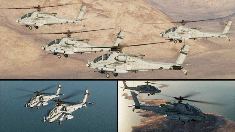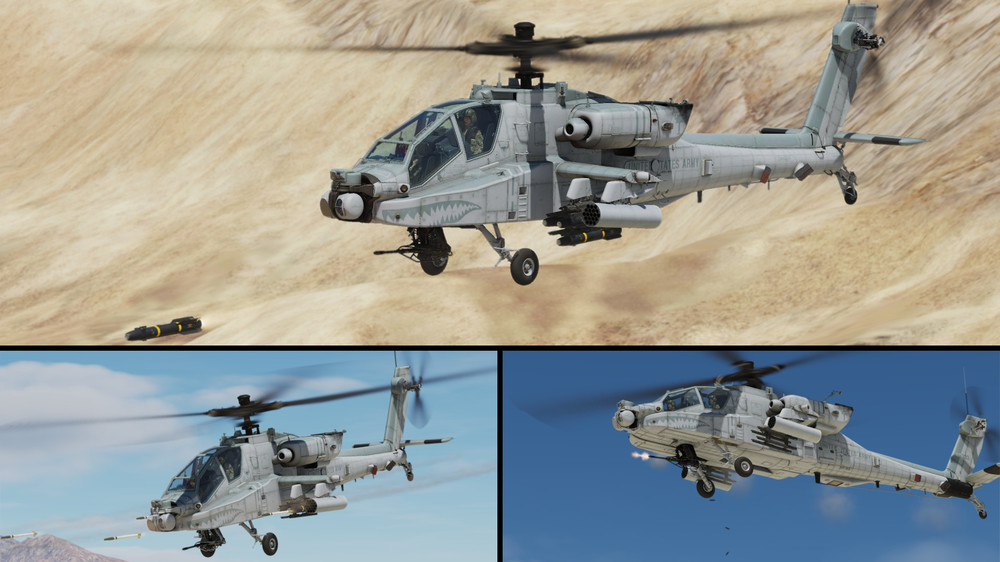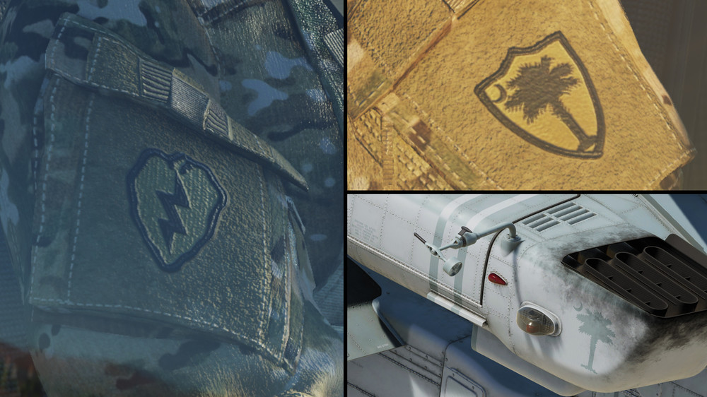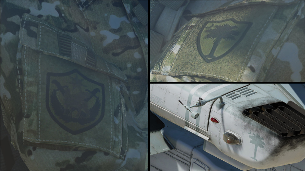 So. I was about 85% done with my own South Carolina National Guard livery when Wilmeister posted theirs here. Figured I might as well finish it off, be a shame to do all that work and then just abandon it. I'll attach the user files link as soon as it's available, but for now, just the pictures. Contains 4 skins; two generic ones (one with the drab gun and partially drab TADS that seem quite common on gray Apaches, one without), as well as two specific aircraft, 40331 and 40332 in about 2004, when the unit was in Iraq. Of note is that, due to using common textures to save on space, none of the skins will work if the gray generic skin isn't present, and 40332 won't work if 40331 isn't present. That can of course be changed if need be, though the file size will approximately triple. Reflecting that they deployed to Iraq with these liveries, the combat patch on the right arm is that given for the Iraq tour, and the patch on the left arm is, of course, the SC ARNG patch. The patches have their own custom roughmets and normal maps, and most of the aircraft has custom roughmets as well. There's also custom textures for the M261 rocket pods and the fuel tanks. There are of course some differences between the AH-64A and AH-64D that made it not an exactly 1 to 1 representation (mostly the exhaust shrouds and the side pods; the top half of the shark mouth in particular goes noticeably further forwards, since the sidepod goes further forwards, and making it the "correct" size resulted in not being able to see much of the mouth from the front).