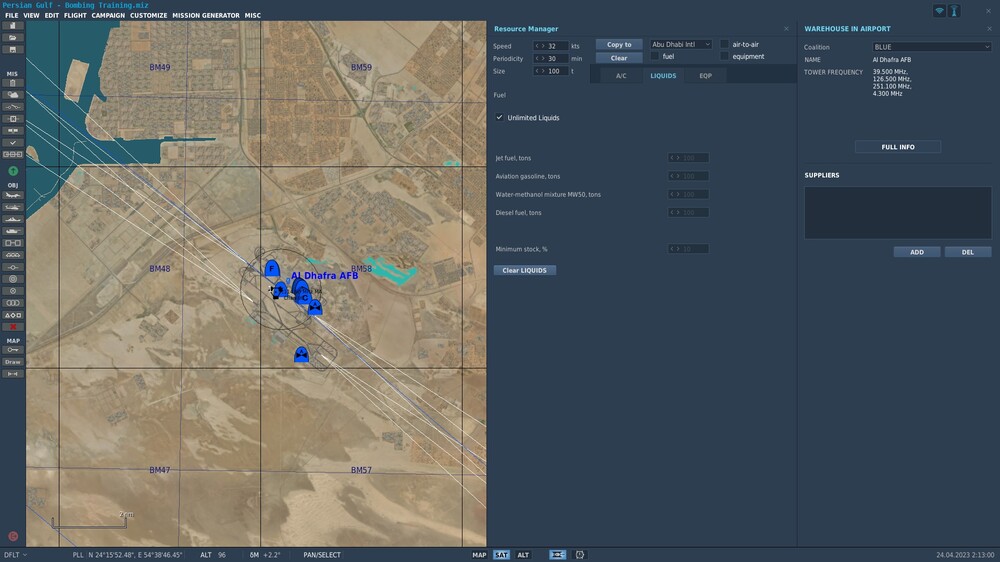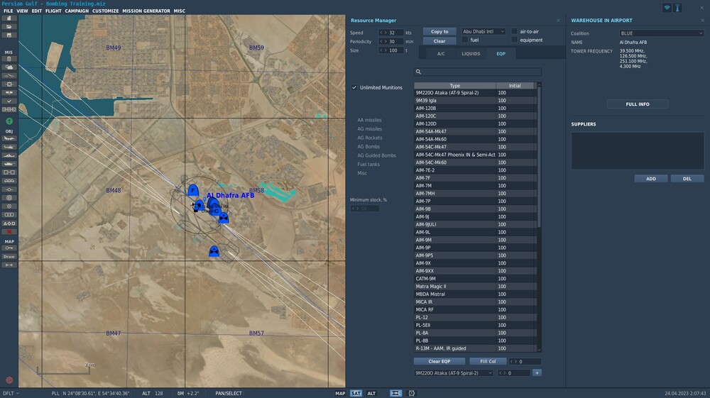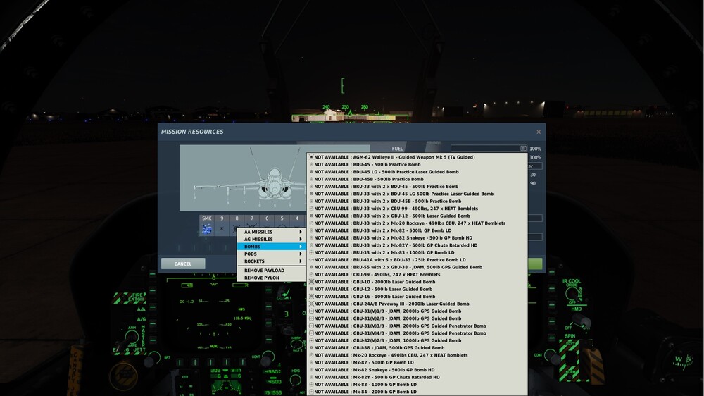 I finished a bombing sortie on a single player mission then landed at Al Dahfra AB to refuel/rearm. When I tried to do so, I got "not available" for every single store for the aircraft and no response from the ground crew. In attempting to research this before I posted, I saw there was a similar bug with the F-16 as I linked below. Al Dahfra AB is set to Blue and unlimited liquids and stores in the mission. I've added screen captures and the .miz file to this post. I have been able to rearm/refuel on this mission before. Has anyone else encountered this issue? Thanks Persian Gulf - Bombing Training.miz