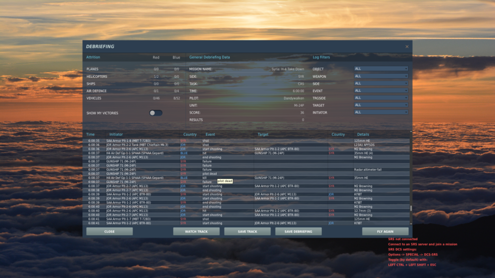 I've lately had several occurrences of total loss of control when my Hind suffered significant damage. I assumed that this was due to some vital control line being severed, however upon investigation I think it may be a pilot kill scenario that isnt giving the "Black screen" as expected, and as has been established in all other aircraft. I have in fact received no black screen death scenarios in the Hind, which seemed odd despite its very well protected cockpit. During the "H-4 Takedown" scenario, I was struck by a Gepard's 35mm HE rounds as shown. I had a loss of any control inputs, and my helo flew into the ground along the path it had been taking before struck. I was unable to change to my ATGM operator position as well in this event, which is odd as the log showed no history of him being killed.