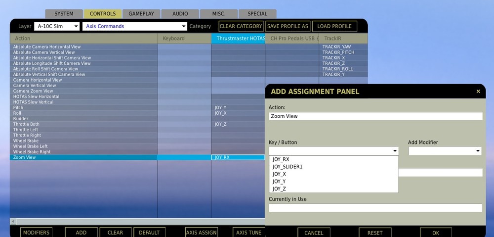 21. Tigersden, When i had my X52 i had it mapped to the slider on the throttle. If you want to try this just go to the axis commands for A 10c Sim in the options. At the bottom is zoom. Under the X 52 column double click on the space for zoom. Then in the dropdown box select joy_slider1. hit ok. If you need to after testing you can adjust the deadzone and tune the axis to you're liking.
