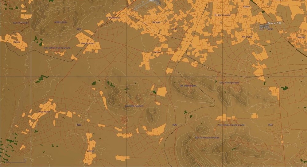 On the map of Syria, special attention is paid to military infrastructure facilities. More than 20 military bases, military training grounds and even military universities have been reconstructed in detail on the map: Al Safira Military Base Durayhim Military Base Al-Assad Military Academy SAA 1st Armoured Division SAA 4th Armoured Division SAA 7th Division SAA 10th Mechanized Division SAA 65th Tank Brigade SAA 67th Artillery Brigade SAA 89th Brigade SAA 100th Regiment SAA 121th Brigade SAA 128th Brigade SAA 155th Artillery Regiment SAA 156th Brigade SAA 158th Brigade SAA 165th Brigade SyADF 24th Brigade SyADF 150th Regiment SyADF 159th Regiment Amiad military base Netafim military base Zfat military base King Hussein Air College All this makes it possible to create interesting detailed scenarios tied to the historical events of peaceful life and military clashes that took place in this territory. SAA 100th Regiment