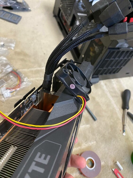Вентилятор на крышке, на двустороннем скотче. Кабель относительно свободно зафиксирован на хомутах к карте. Нигде ничего даже не натянуто, а так - пристраховано.