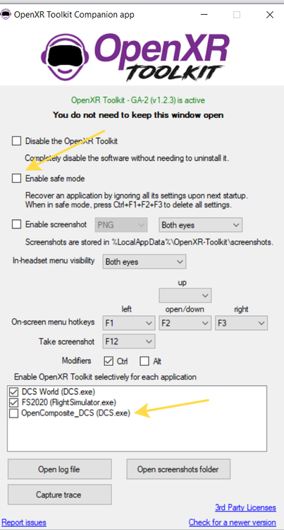 10. Турбо у меня работает, а вот репроекцию надо отключать. Если на старте виснет, то нужно зайти в OpenXR Toolkit и включить там безопасный режим, а еще снять галку с OpenComposite_DCS. null Потом зайдя в DCS вызываешь меню OpenXR Toolkit по CTRL+F2, сбрасываешь в нём все настройки через соответствующий пункт и настраиваешь потом по-новой, (только не включай репроекцию!).