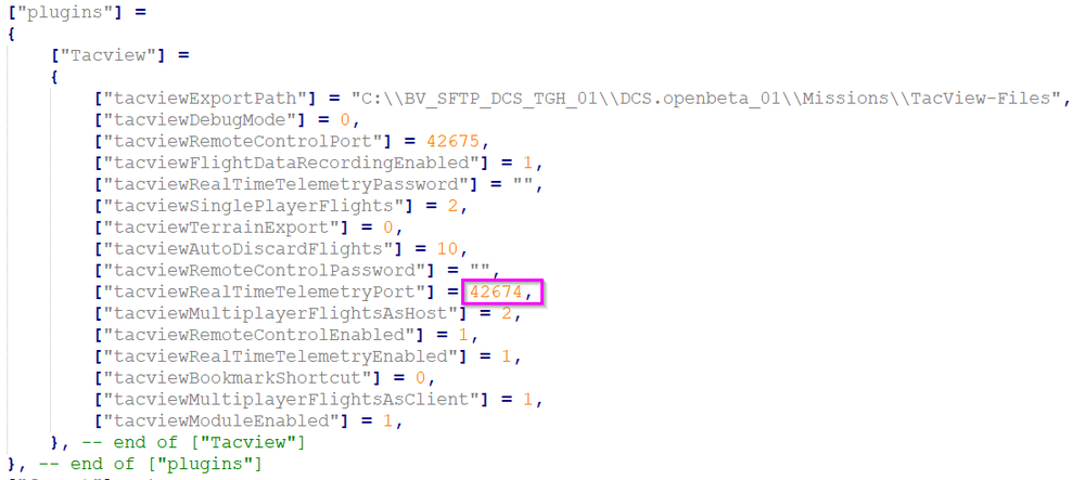 Now I've got it wokring with changing options.lua entries to: ["plugins"] = { ["Tacview"] = { ["tacviewExportPath"] = "C:\\BV_SFTP_DCS_TGH_01\\DCS.openbeta_01\\Missions\\TacView-Files", ["tacviewDebugMode"] = 0, ["tacviewRemoteControlPort"] = "42675", ["tacviewFlightDataRecordingEnabled"] = true, ["tacviewRealTimeTelemetryPassword"] = "", ["tacviewSinglePlayerFlights"] = 2, ["tacviewTerrainExport"] = 0, ["tacviewAutoDiscardFlights"] = 10, ["tacviewRemoteControlPassword"] = "", ["tacviewRealTimeTelemetryPort"] = "42674", ["tacviewMultiplayerFlightsAsHost"] = 2, ["tacviewRemoteControlEnabled"] = true, ["tacviewRealTimeTelemetryEnabled"] = true, ["tacviewBookmarkShortcut"] = 0, ["tacviewMultiplayerFlightsAsClient"] = 1, ["tacviewModuleEnabled"] = true, }, -- end of ["Tacview"] }, -- end of ["plugins"] -