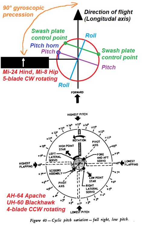 Simply, the swash plate is controlled so its tilted 90° precceding the tilt of rotating blade disc due to compensation of Gyroscopic precession effect. !!! EDIT: NOT EXACTLY TRUE - SOLUTION IS DESCRIBED BY ME IN THE TOPIC DOWN BELLOW !!! In DCS the movement of swash plate and rotor blade disc is in same plane - WRONG. SIKORSKY_HELICOPTER_FLIGHT_THEORY FOR PILOTS AND MECHANICS - ADA119096 - starting at page 27 Mi8_swash_plate_BUG.trk Mi-24_swash_plate_BUG.trk In the video bellow, when the swash plate tilted to the side, the blade disc in flight will be tilted forward or aft - controlling the PITCH.