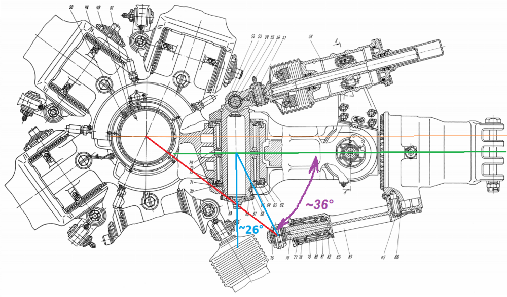 Drawing from which I measured the angle of pitch horns 36° (Tau) and falp stiffening angle 26° (Sigma) HOW THE ANGLE σ1 BETWEEN PITCH HORN AND HORIZONTAL (FLAPPING) HINDGE IS AFFECTING THE BLADE ANGLE ф : (ΔΨупр - is the offset angle of swash plate control = for Mi-8/24 it is the 21° ) Угол опережения изменения циклического шага лопасти определяется коэффициентом компенсатора взмаха лопасти (к), углом поводка лопасти σ11 и средним углом поворота (отставания) С0 лопасти относительно вертикального шарнира [6]: ΔΨупр =< σ11 - С0 - arctg(k) (1) Компенсатор взмаха в системе управления лопастями несущего винта (рис.29) - это особая кинематическая связь угла установки лопасти ф от угла взмаха лопасти β НВ при ее вращении в своей плоскости, обеспечивающая автоматическое уменьшение угла установки лопасти при взмахе вверх и увеличение его при опускании лопасти. Это нужно для регулирования и ограни чения взмаха лопасти в плоскости ее вращения. DeepL translation: The advance angle of the blade cyclic pitch change is determined by the blade sweep compensator coefficient (k), the blade leash angle σ11 and the average angle of rotation (lag) С0 of the blade relative to the vertical joint [6]: ΔΨупр =< σ11 - С0 - arctg(k) (1) The blade sweep compensator in the main rotor blade control system (Fig.29) is a special kinematic link between the blade setting angle ф and the blade sweep angle β HB during its rotation in its plane, which provides automatic reduction of the blade setting angle during upward sweep and its increase during blade descent. This is necessary to regulate and limit the blade sweep in the plane of rotation. -