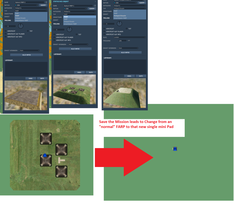Hey I noticed a strange behaviour. If I place a normal FARP and Save the .miz the FARP changes to the new "mini farp pad". I noticed that the normal FARP and the new Pad are named the same (see picture). I already repaired my DCS to preclude errors in my installation