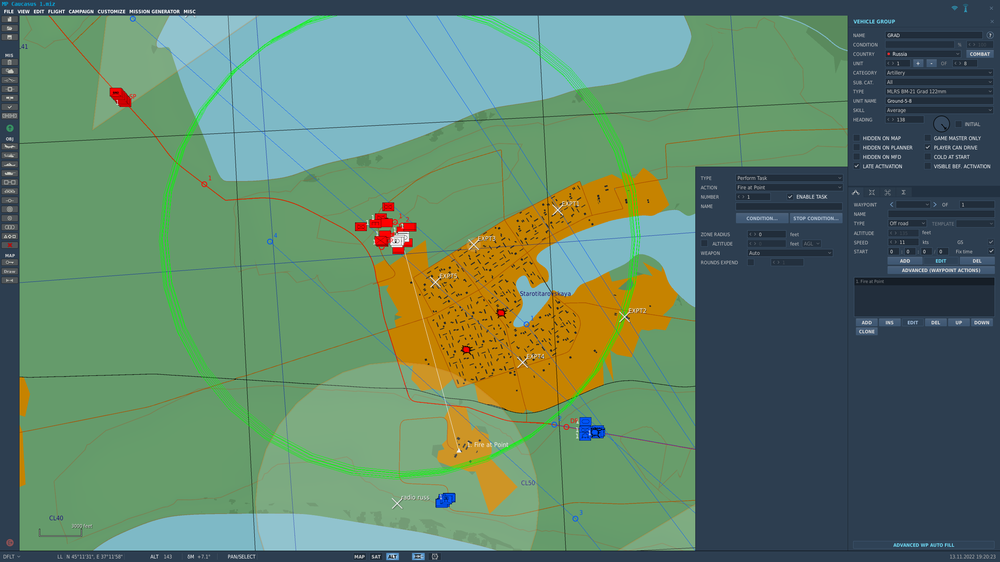 Hi! I am not able to set Grads firing continously on a area on the map (e.g. a little village). Putting 5 Grads MLRS BM-21 GRAD 122mm on the map with the Advanced Waypoint action "fire at point" with putting the triangle at the point within the yellow circle (see SC) but they are not firing. Doying the same with a group of SPH 251 Gvodzdika 122mm works pretty fine. The are continously firing at the ordered location. What im doin wrong with the GRAD? Can they fire only once maybe? Do i have to reammonition them?