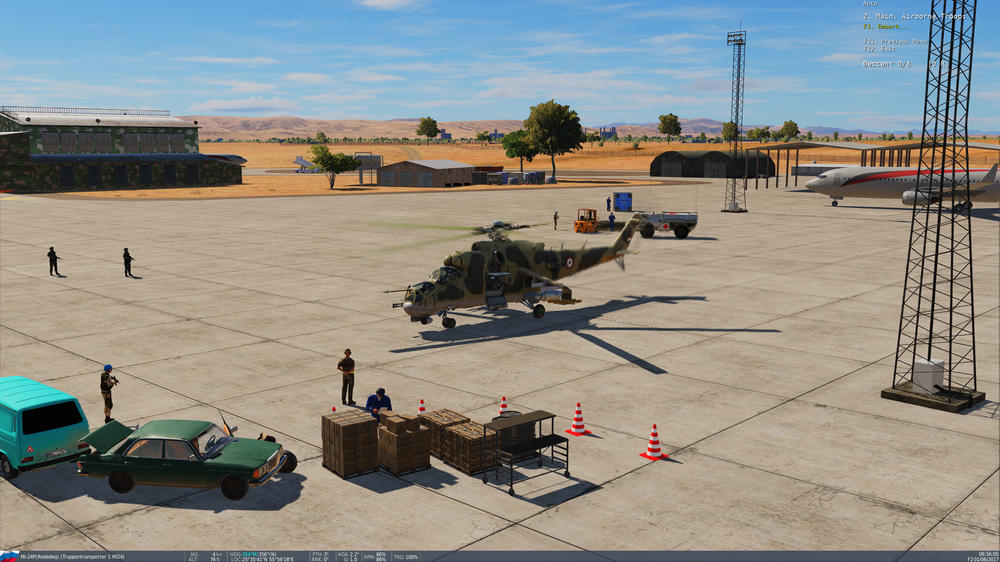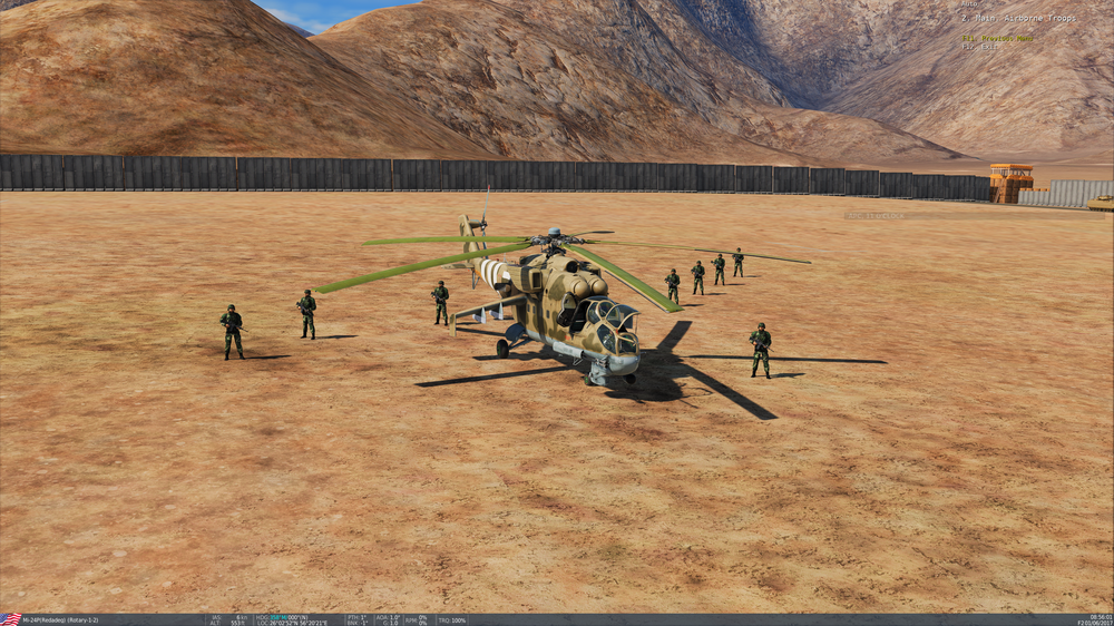 Hi there...im really confused. And i mean: realy I made a Mission, taking of on airport, flying to a FARP, picking up a squad of M4 men and the transport them to the combat area. Worked fine I made a Hold trigger on the platoon, Stop Condition Flag, when i land with my HIND in front of them, they start movin to wp1 directly in fron of my chopper. This waypoint has a "Embark to transport" tag. HIND, Radius 600....all good. It worked! But since today (i installed the latest patch, nothing else changed) i get no "Embark" command in radio. (see screenshot) Puh, now my mission is completely F***ed cause i need this troops in the combat area for the next trigger... It would be really much apreciated if someone exlains me why it had stoped working. I did this mission already without issues.... Here is the mission to download...maybe i did something wrong? But why it worked yesterday like a charme? When i place the troops on the airport whre is tart it works as well. Only in the Farp not. (see 2nd screenshot - taken at airport) (Truppentransporter 1 + 13. Kompanie) http://www.steidele-stromverteiler.de/dcs/khasab.miz
