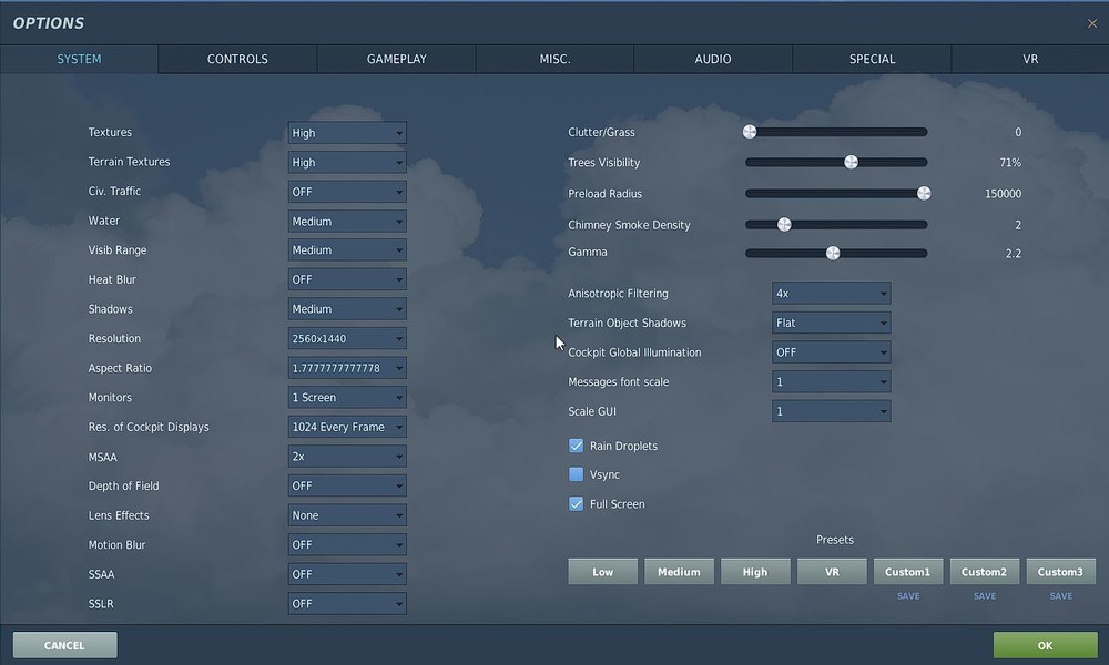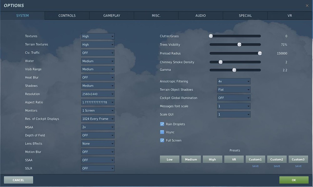 Eben ! Ich möchte nicht "alles" auf Minimum haben. Ein bisschen besser darf es gerne sein. Hier meine Settings: Mit der F/A-18 bekomme ich auf der Syrien Map minimum stabile 45 FPS mit einer Frametime von 12ms. Damit läuft es smooth ohne Ruckler. Also, natürlich im Tiefflug über große Städte und seitlich aus dem Cockpit geschaut. Mein Finetuning besteht darin rauszufinden, was besser funzt. Steam SS anzupassen oder bei 50% lassen und DCS Pixel Density höher zu setzen. Da taste ich mich gerade ran. Vielleicht noch, durchschnittliche FPS liegt hier bei 55 FPS.