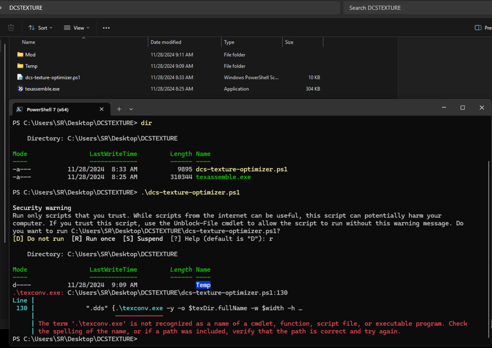 I've tried both. The instructions from OP and those I quoted. The texassemble.exe file is clearly in the directory with the script. I see now... I downloaded the texassemble instead of texconv.exe null did I mention I'm stoopid?