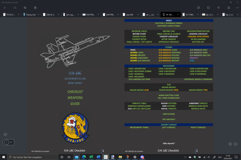 Thanks to all for the kind words! Appreciate it! Though found some errors in pdf which I am correcting just right now. Upload will follow today. Version number is indicated in the lower left corner by e.g. "REV 30052021"... Just renamed the "F/A-18C Checklist" to "F/A-18C Flight Manual [chapter-1]", as chapter-2 will follow, on which I am also working right now. But need to say, that "chapter-2" is a bit "insane". It's a bit more of "educational" use. And yeah... kneeboard shows still "not active". It's gonna take some more time for ED to release it... -