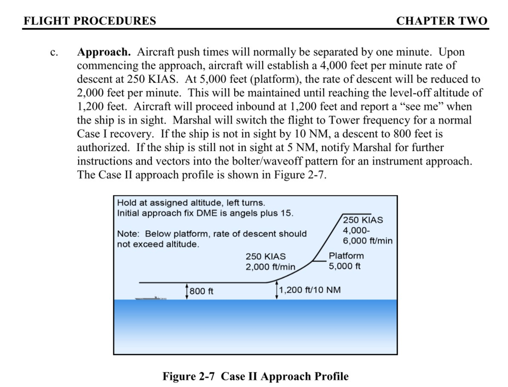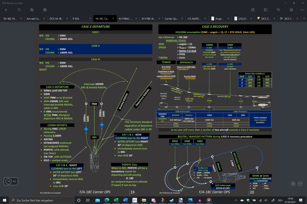 Hey everyone, I got two questions concerning CASE II recovery… as I cannot find the exact procedure in the manuals… 1st scenario: WX is such as you can complete the recovery with a CASE I recovery. Starting the CASE II recovery until 10NM it will be the same as a CASE III recovery, thus your IAS will be 250kts until 10NM. So assuming that you break the clouds after 10NM and going visual with the carrier, you ought to fly the rest of pattern as a CASE I recovery (via initial, break, downwind, groove and land). QUESTION: At the point where you get visual (between 10NM and 5 NM) are you going to speed up to 350kts in accordance to CASE I recovery? In my opinion I would say “yes” as continue flying with a “wrong” speed of 250kts for a CASE I will give you different parameters and gates. 2nd scenario: Same as above with the difference that you are able to break the clouds at 10NM but cannot get visual with the carrier at 5NM. Now the manual says, that you are being vectored into the “waveoff / bolter pattern” for a CASE III recovery. QUESTION: How exactly are you going to fly it “speedwise”? Are you going to configure to “FLAPS… half” just after passing inbound 5NM, or are you keeping IAS at 250kts until being vectored into the pattern? Or are you just going to do the “pilot stuff” and configure the hornet according to your “personal pattern”? Thanks for your help!