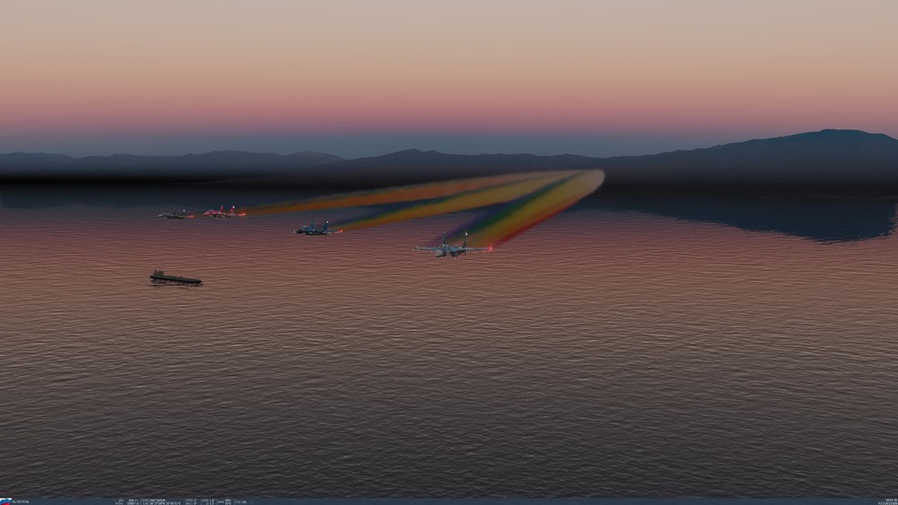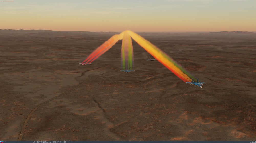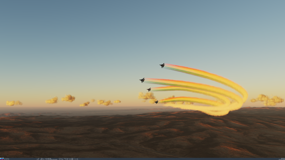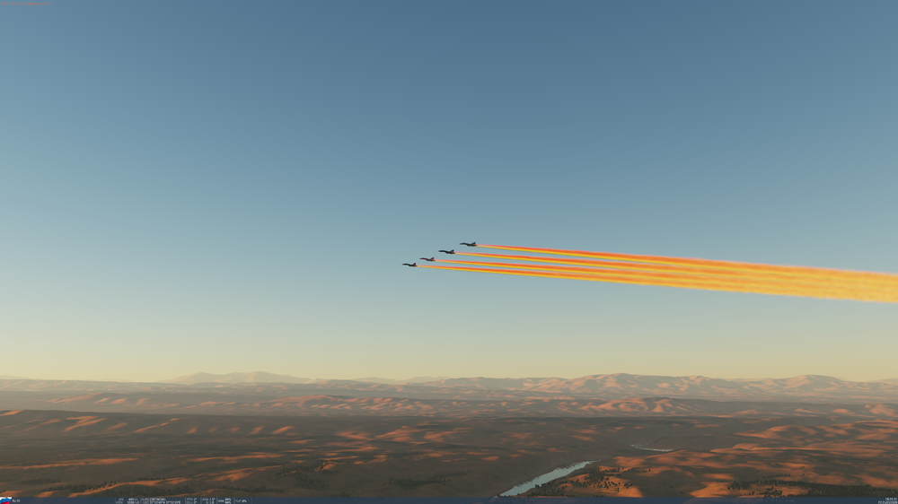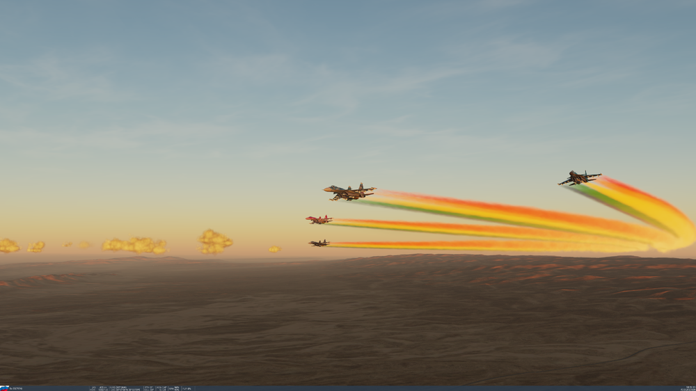 Hi all, tried to post here several times, just moving pics in the text-box, hope now I found the right way... Swarm is called "Rainbow1" and it´s Atze in the Syria SU-33, then Hans in the IceWolf, Helmut in Pinkie and Holgi in the Bundeswehr. Not easy to keep them together all the time, u have to lead them constantly so they don´t need too much fuel for maneuvers... I was surprized how easy it is, well, if u have some time and some interest (lol)... Guess I will accompany this sim for a longer time... Thx to all those professional painters who did the wonderful skins, I love it. Seems to be an active community here, great... Greets from Atze
